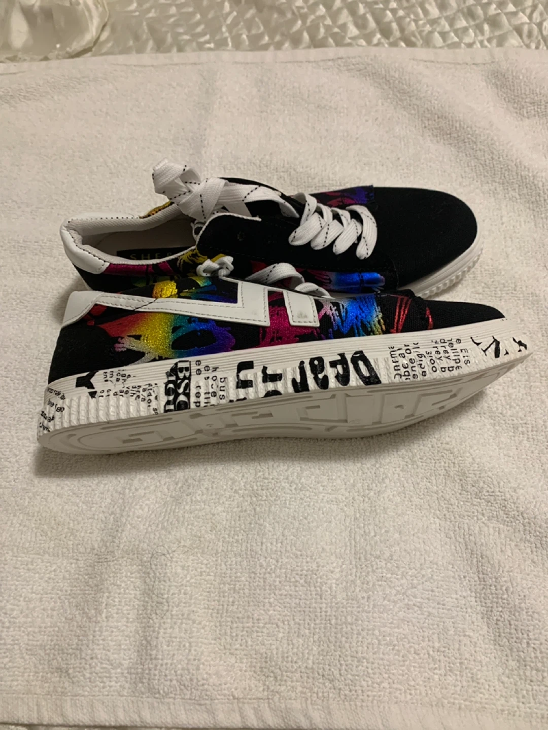These SHEIN sneakers feature a black canvas with a vibrant, colourful graphic print and text detailing on the sole. They have white laces and a white sole. Good for casual wear.