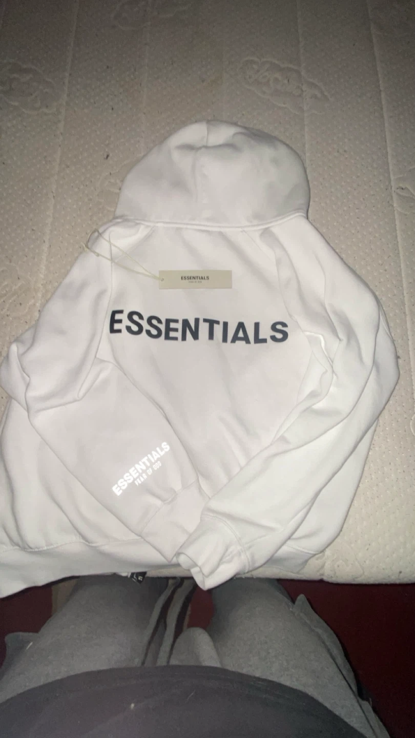 This is a white Fear of God Essentials hoodie. It features large ESSENTIALS branding across the chest and smaller ESSENTIALS branding with "FEAR OF GOD" text on the sleeve. It's a cozy pullover style with a hood. This hoodie is great for everyday casual wear.