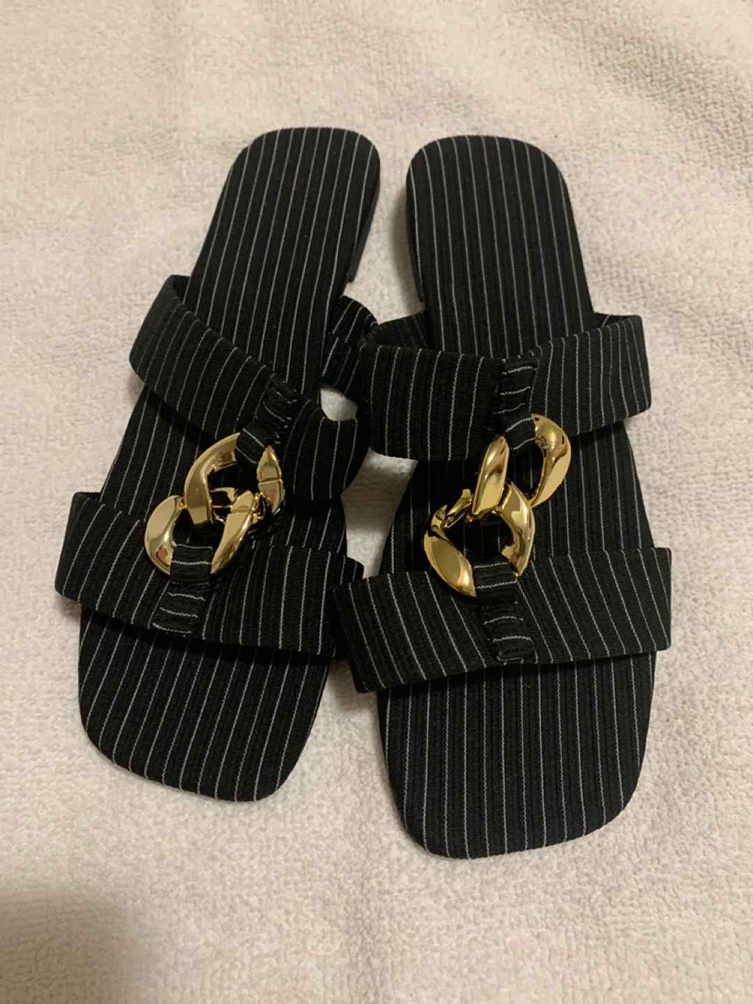 These stylish slide sandals feature a classic black pinstripe fabric. They have a wide strap across the foot with a decorative gold chain accent. These are great for casual wear!