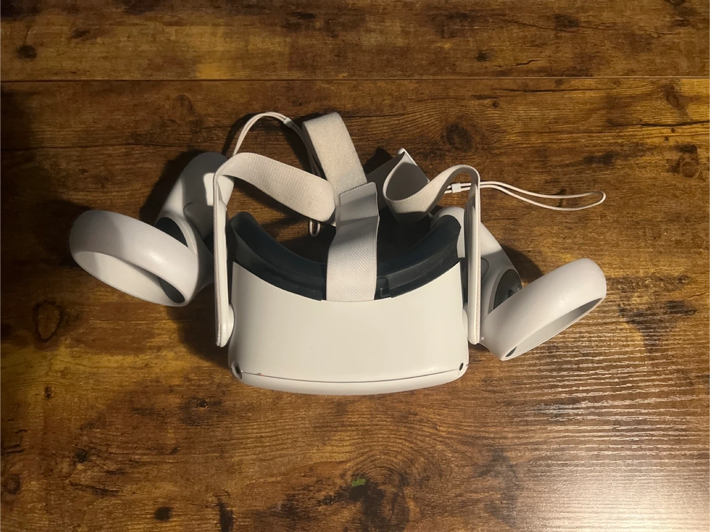 This is an Oculus Quest 2 virtual reality headset with its controllers. It's white and comes with the necessary straps for comfortable wear. It's perfect for immersive gaming experiences.