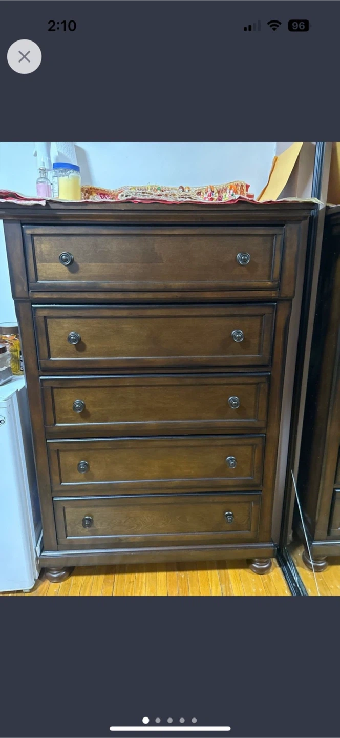 This is a sturdy five-drawer chest made from solid wood with a rich brown finish. It features classic metal drawer pulls and decorative detailing along the edges. The chest has a dark wood stain.