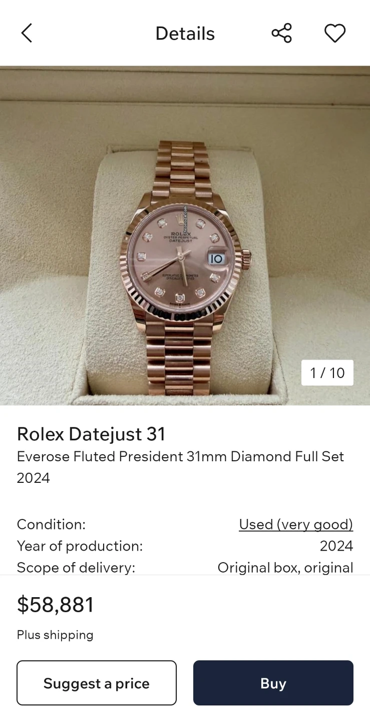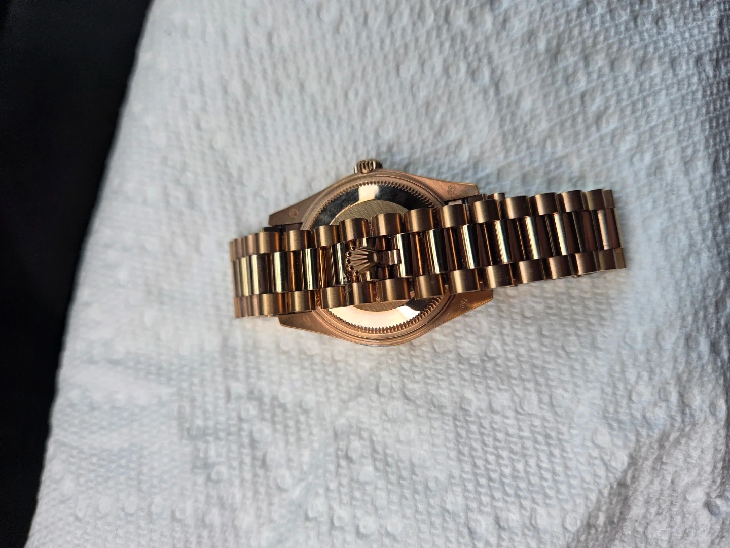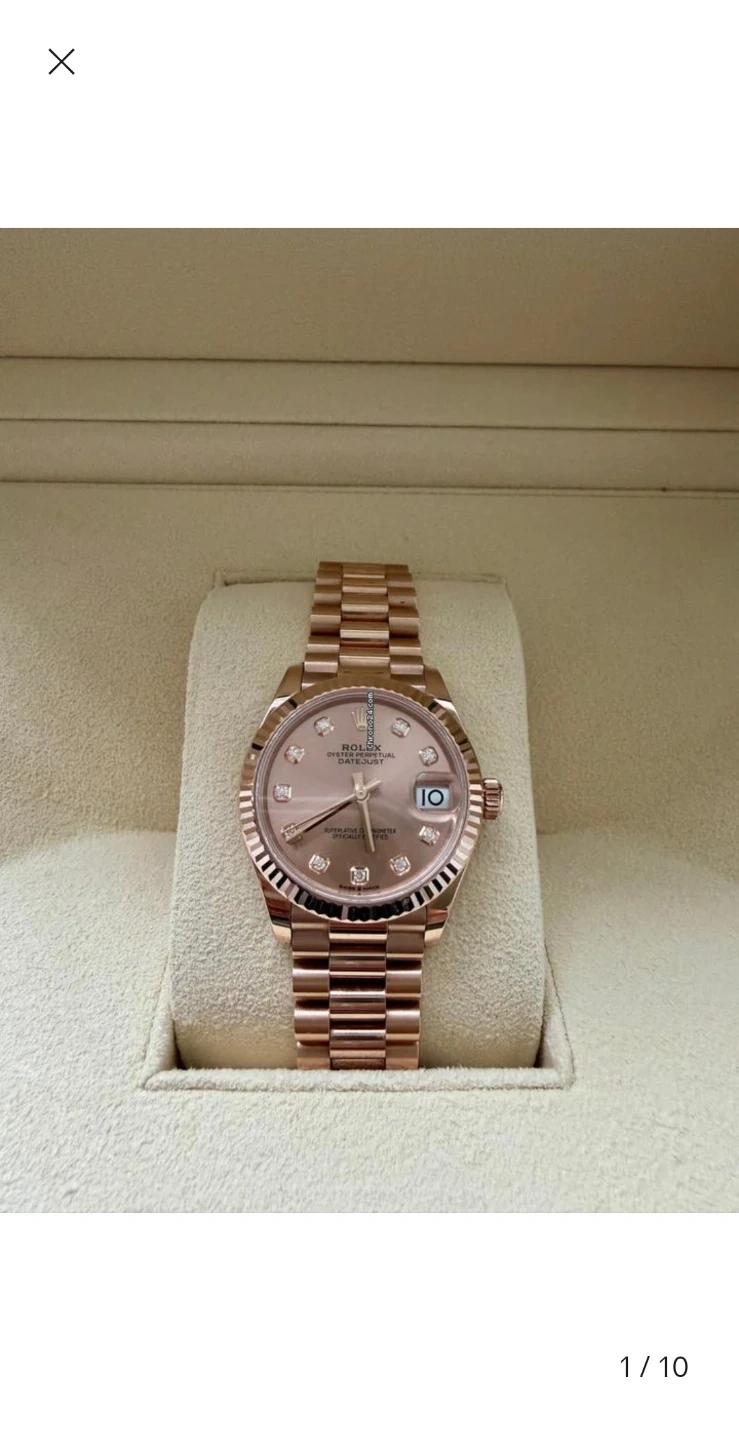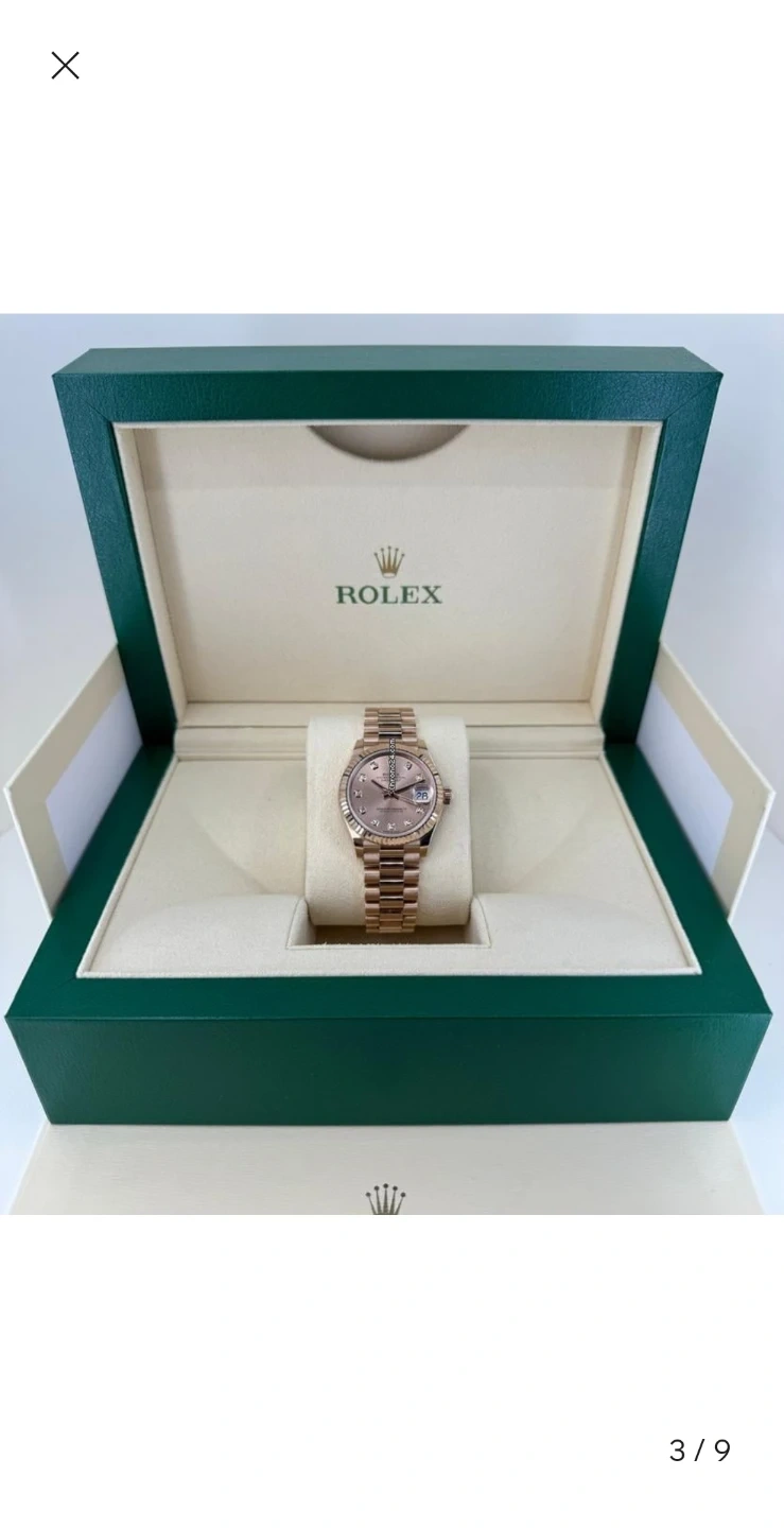 This Datejust woman's watch is 18 ct Everose gold features a chocolate, diamond-set dial and a President bracelet.