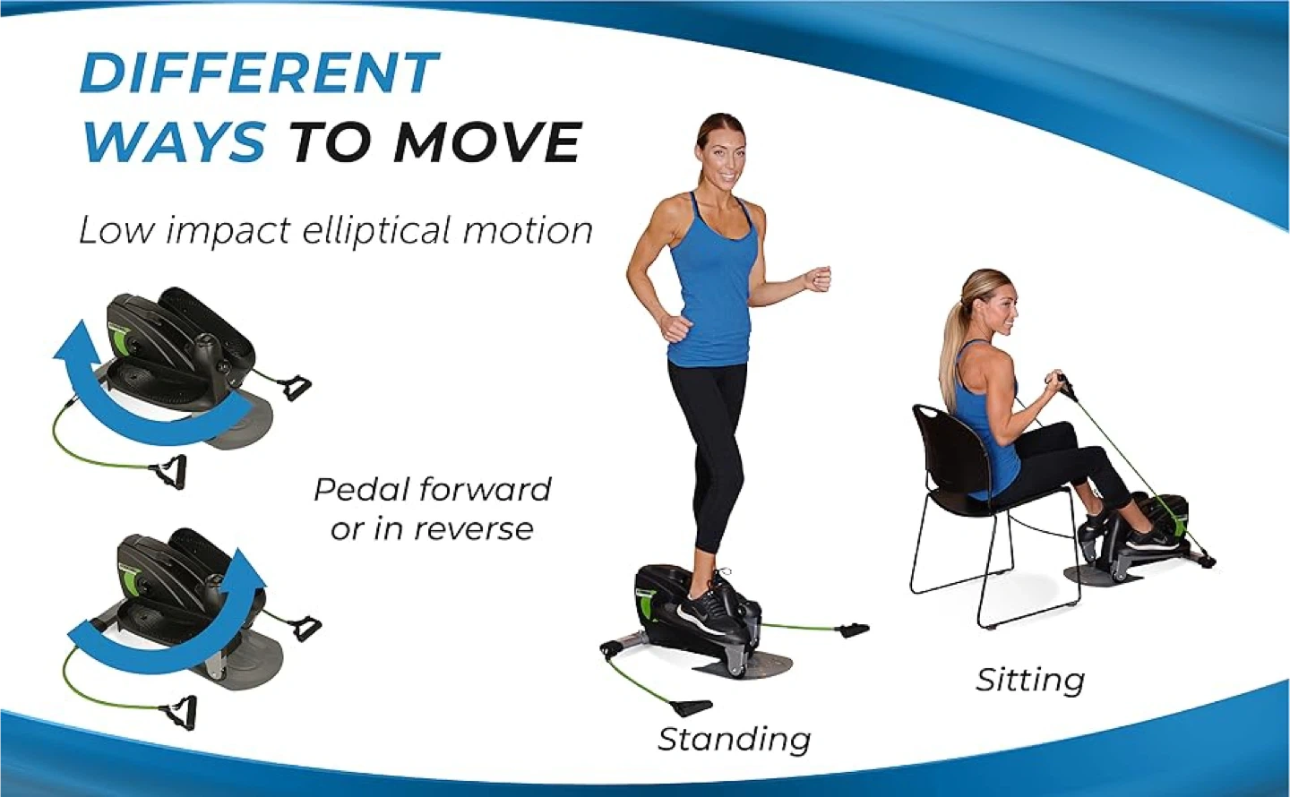 Stamina InMotion compact elliptical. Can be used sitting or standing.Includes resistance cords. Compact and easy to store.