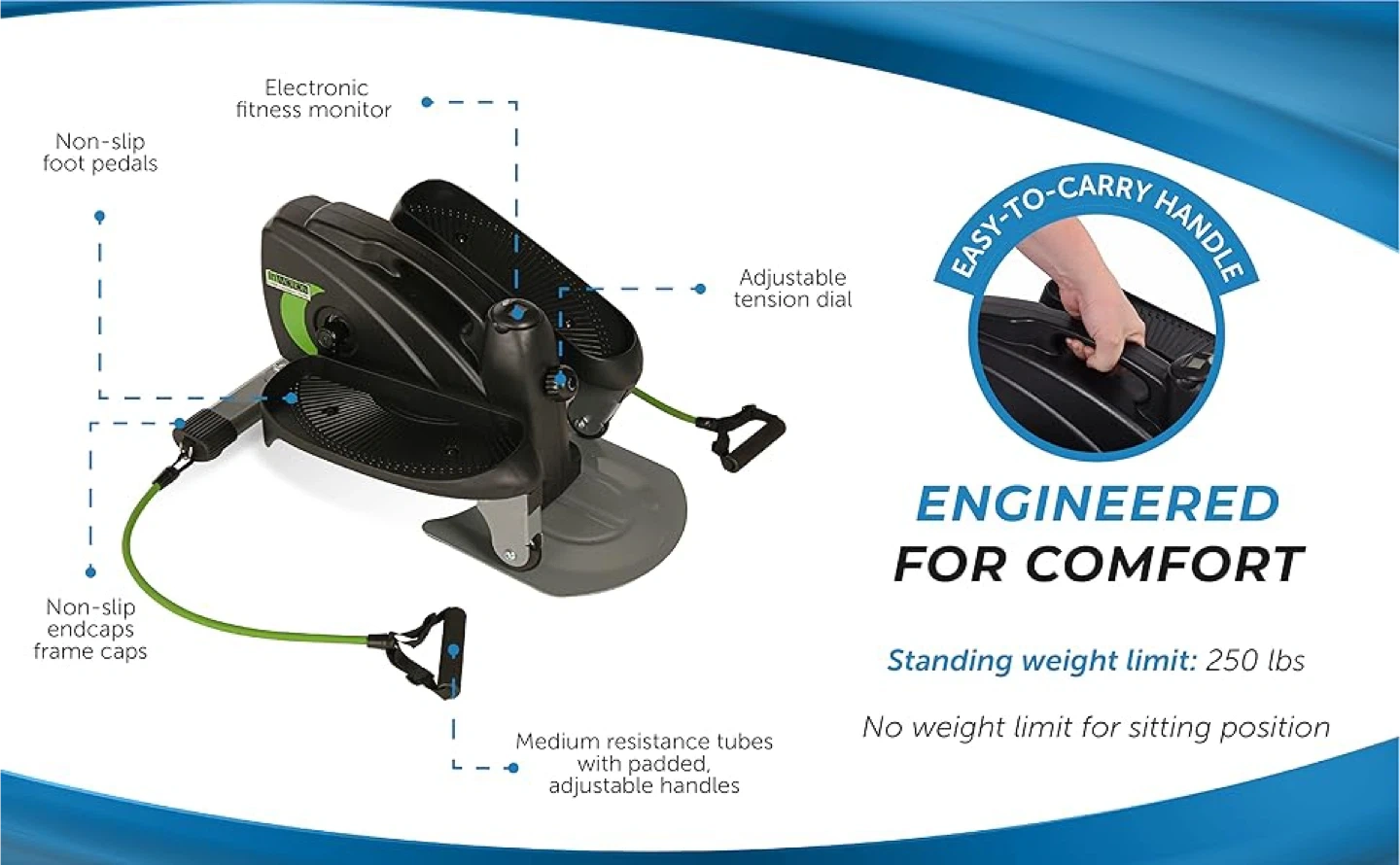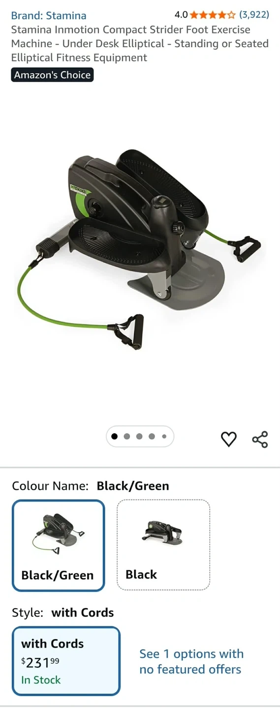 Stamina InMotion compact elliptical. Can be used sitting or standing.Includes resistance cords. Compact and easy to store.