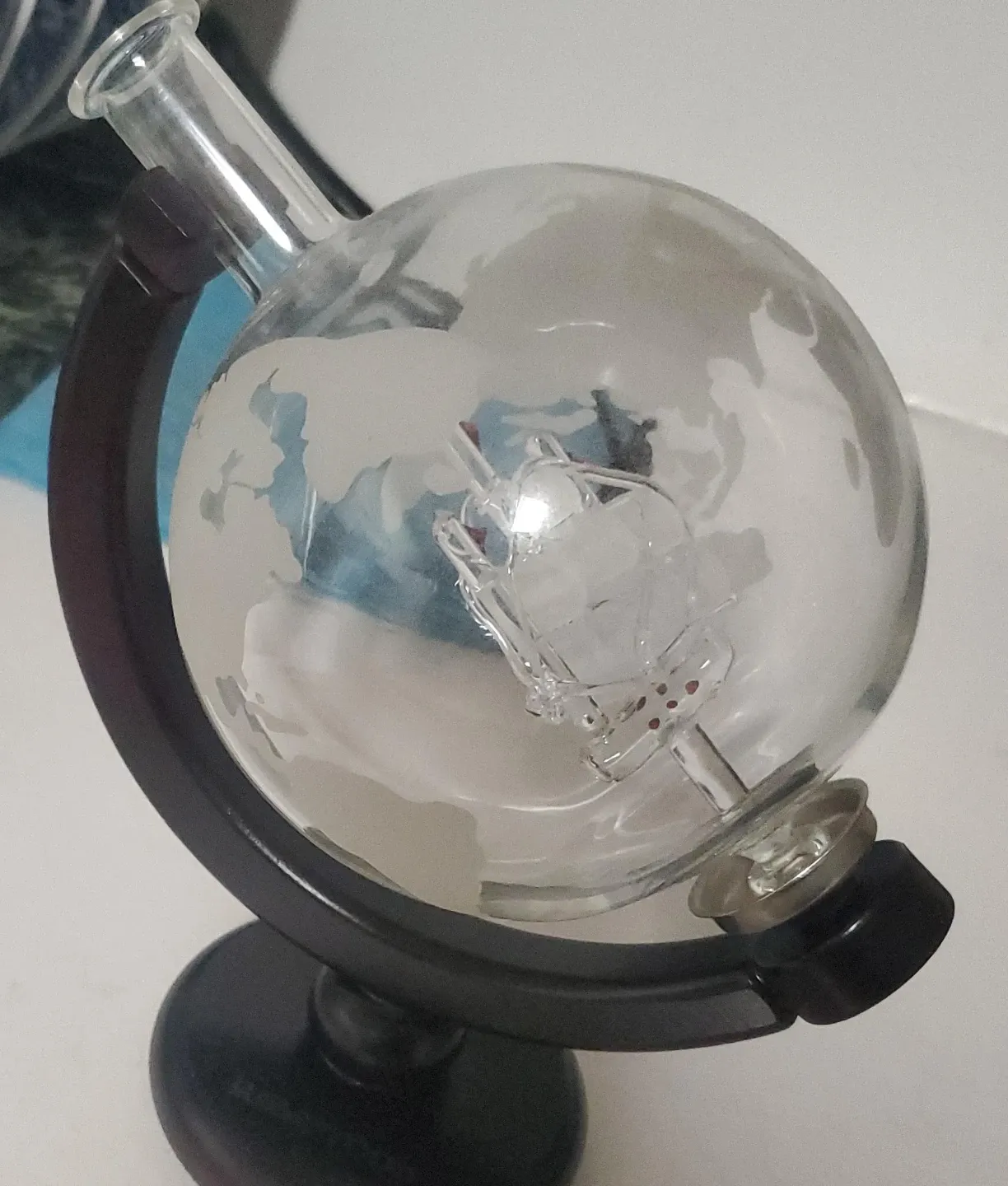 Unique glass decanter shaped like a globe, featuring a detailed ship inside. It's perfect for displaying spirits or as a decorative piece. Glass material, stands on a dark base.