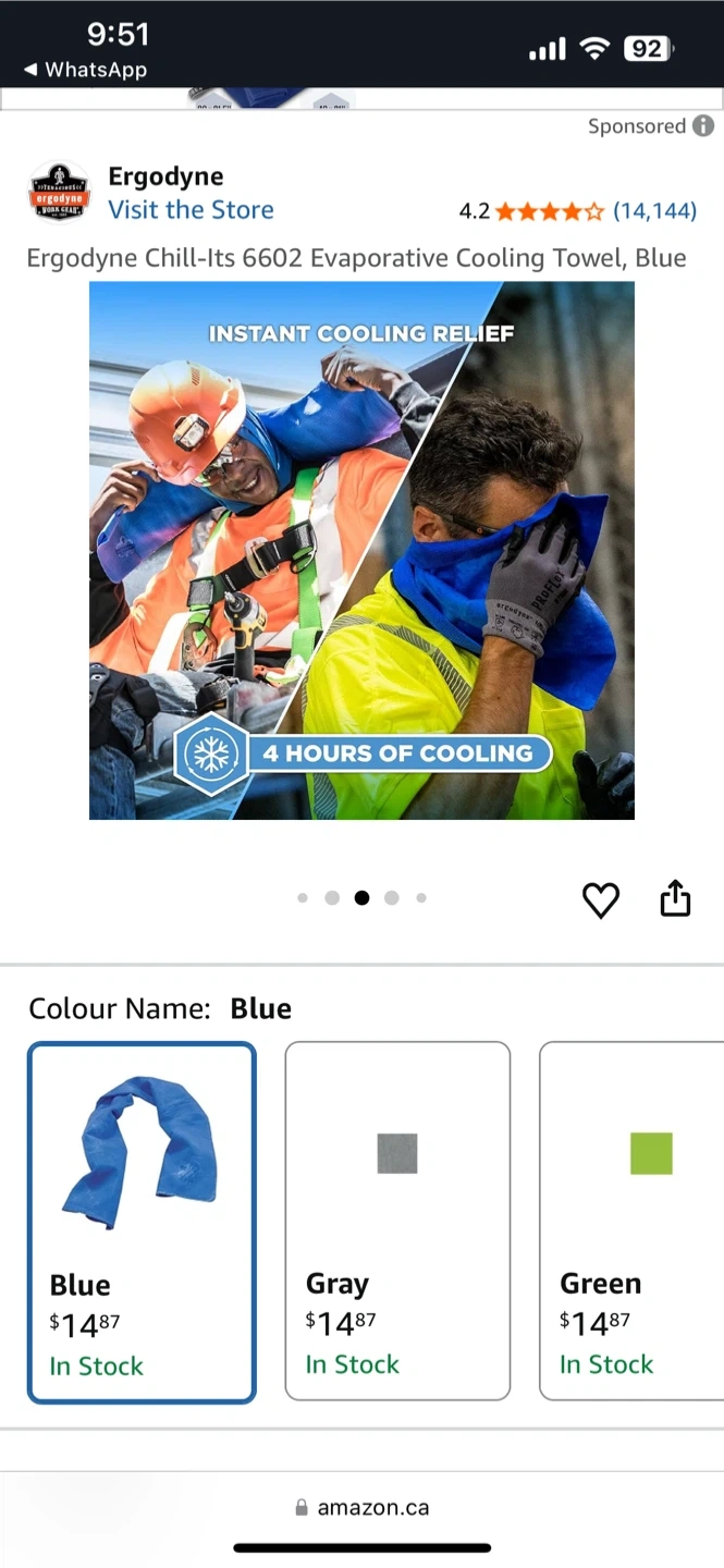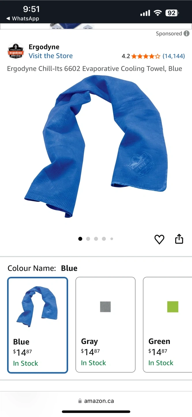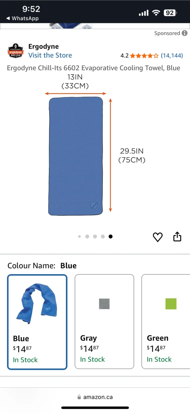 This is an Ergodyne Chill-Its 6602 evaporative cooling towel in blue. It measures 13IN x 29.5IN (33CM x 75CM). The PVA material becomes stiff when dry and softens when re-wet. It's machine washable.