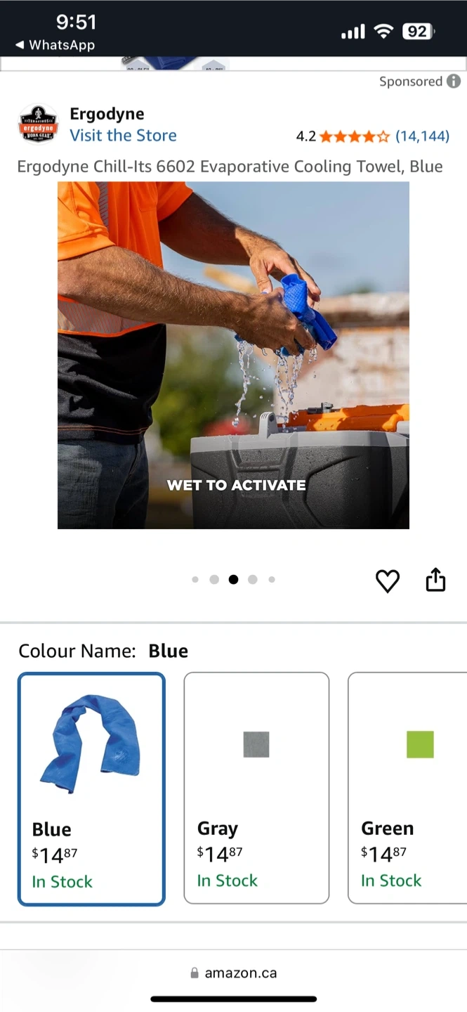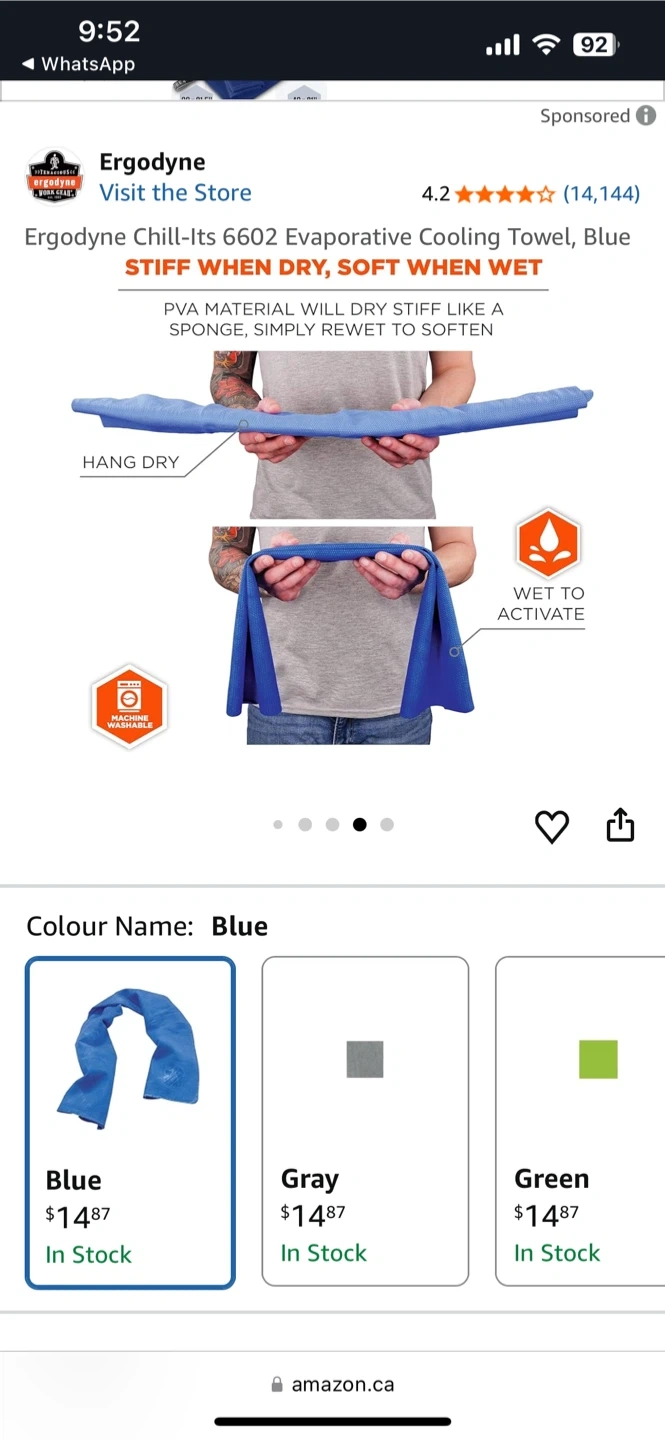 This is an Ergodyne Chill-Its 6602 evaporative cooling towel in blue. It measures 13IN x 29.5IN (33CM x 75CM). The PVA material becomes stiff when dry and softens when re-wet. It's machine washable.