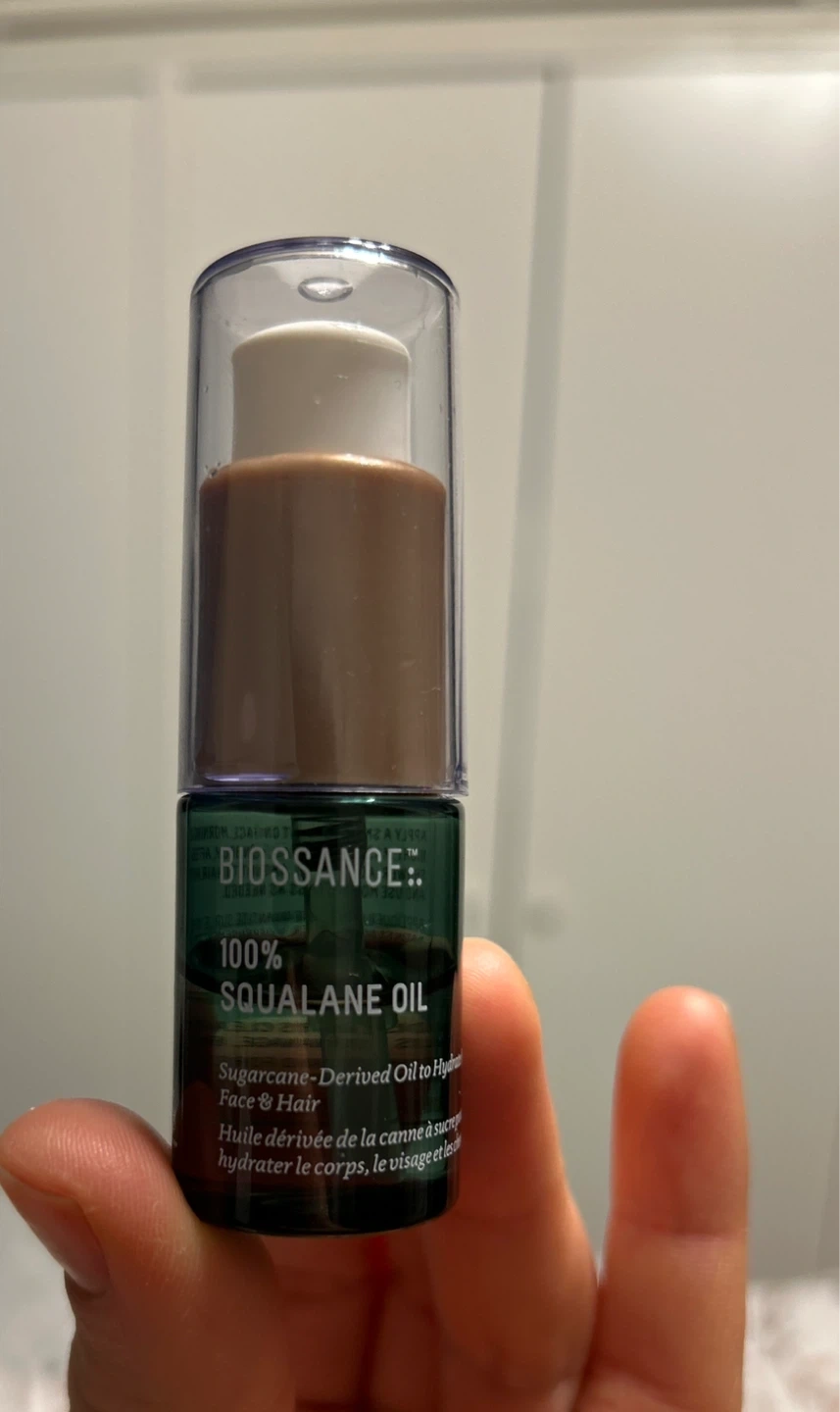 This is Biossance 100% Squalane Oil. It's sugarcane-derived oil for face and hair. This oil helps to hydrate the body, face, and hair.
