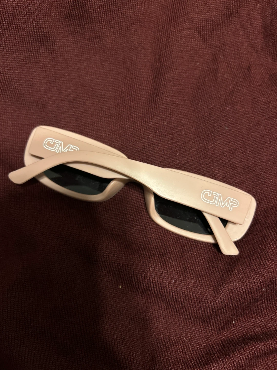 These CJMP sunglasses are a stylish beige colour. They're a modern rectangular shape with black lenses. Adds a nice touch to any outfit!