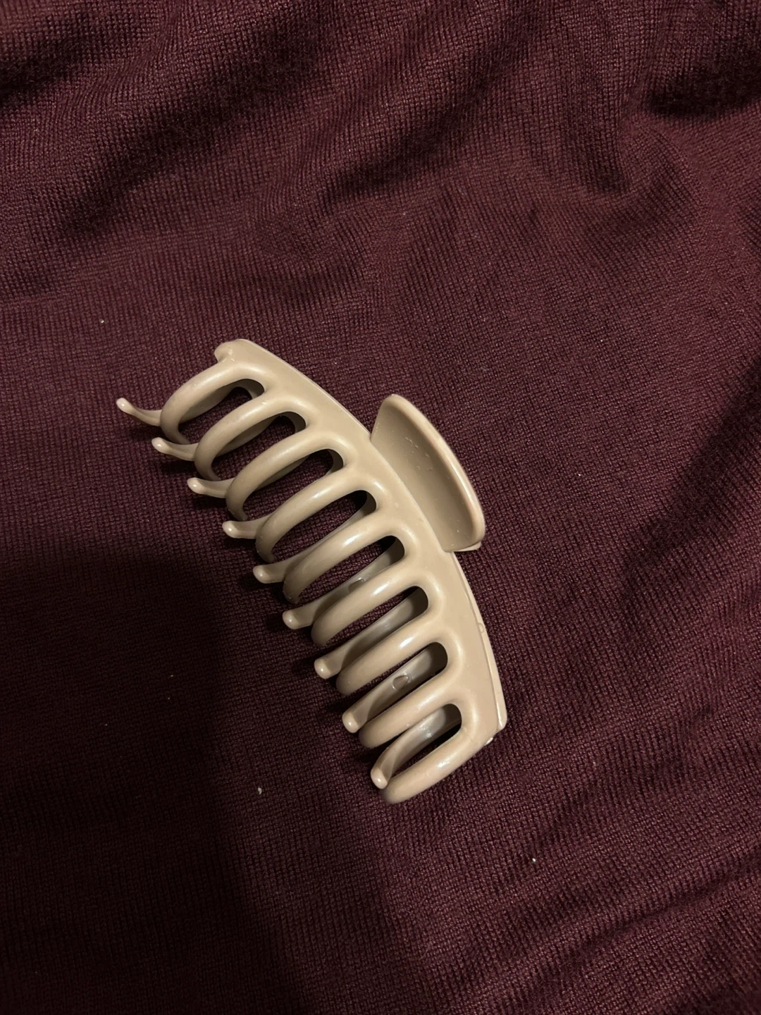 A large claw clip, perfect for holding back thick hair. It's made of durable plastic and measures approximately 4 inches long. This clip is great for quick updos or securing your hair throughout the day! Comes for free if you buy something