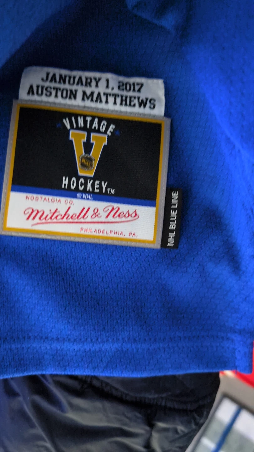 This is a Mitchell & Ness vintage hockey jersey featuring Auston Matthews. It's a size 2XL with blue, white, and grey colours. The jersey is designed for NHL Blue Line. This is a winter classic replica made excluvely by Mitchell and Ness for the NHL.