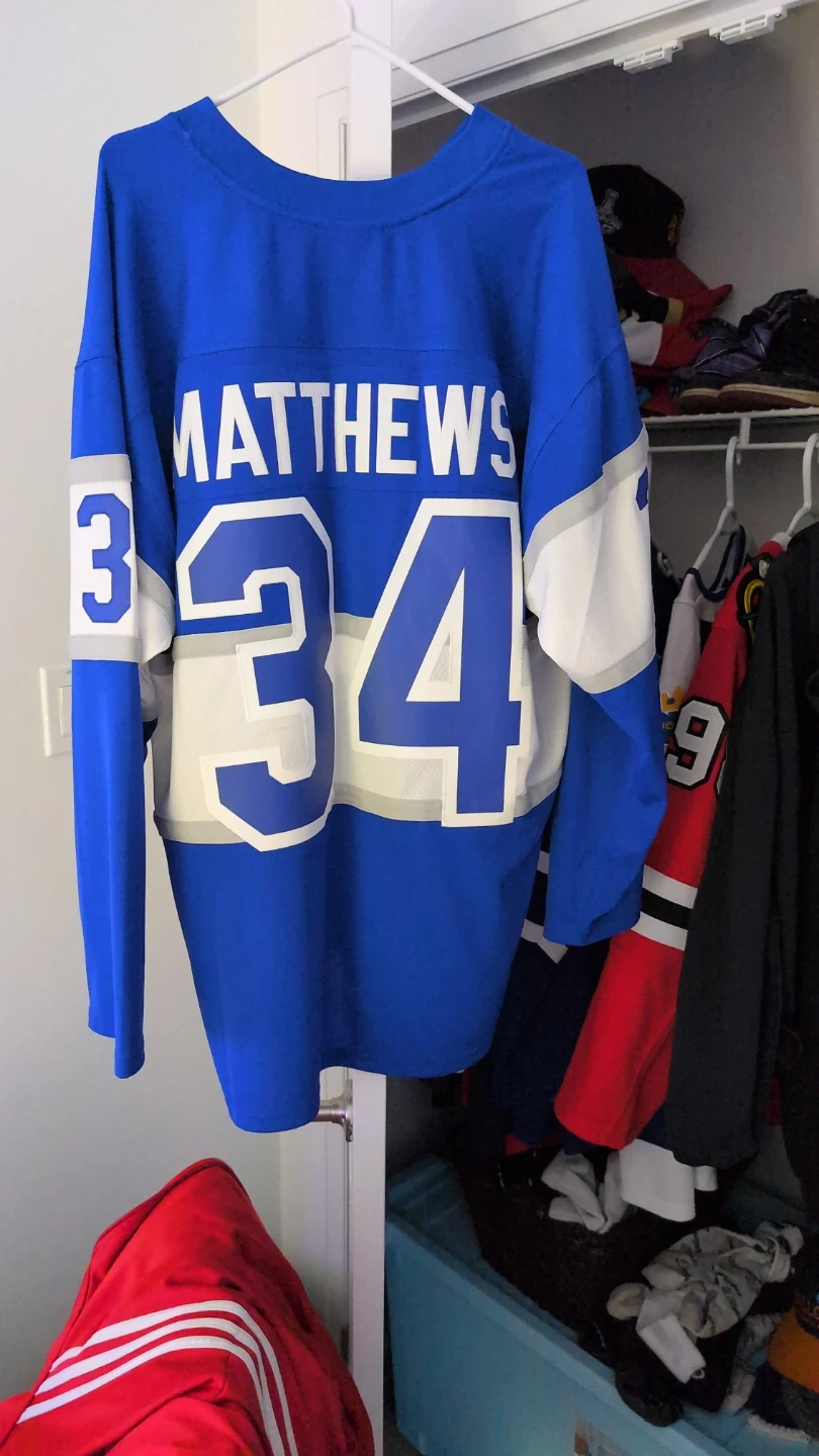 This is a Mitchell & Ness vintage hockey jersey featuring Auston Matthews. It's a size 2XL with blue, white, and grey colours. The jersey is designed for NHL Blue Line. This is a winter classic replica made excluvely by Mitchell and Ness for the NHL.