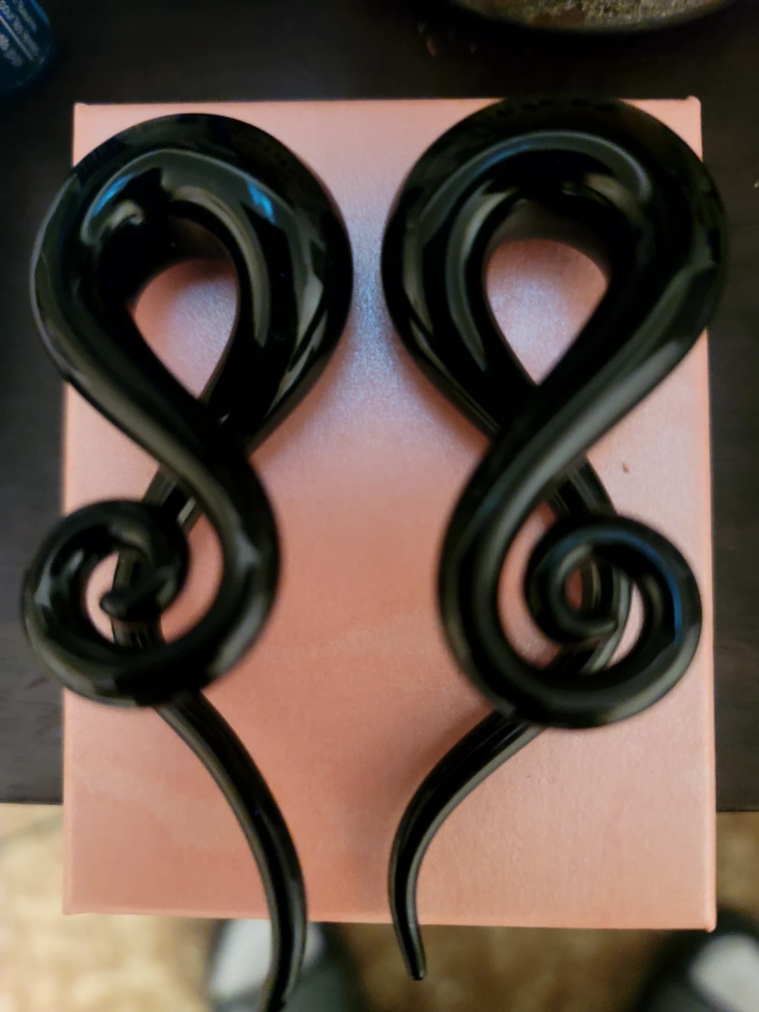 Pair of black spiral ear gauges. These are made of glass. They're a unique accessory for stretched ears.