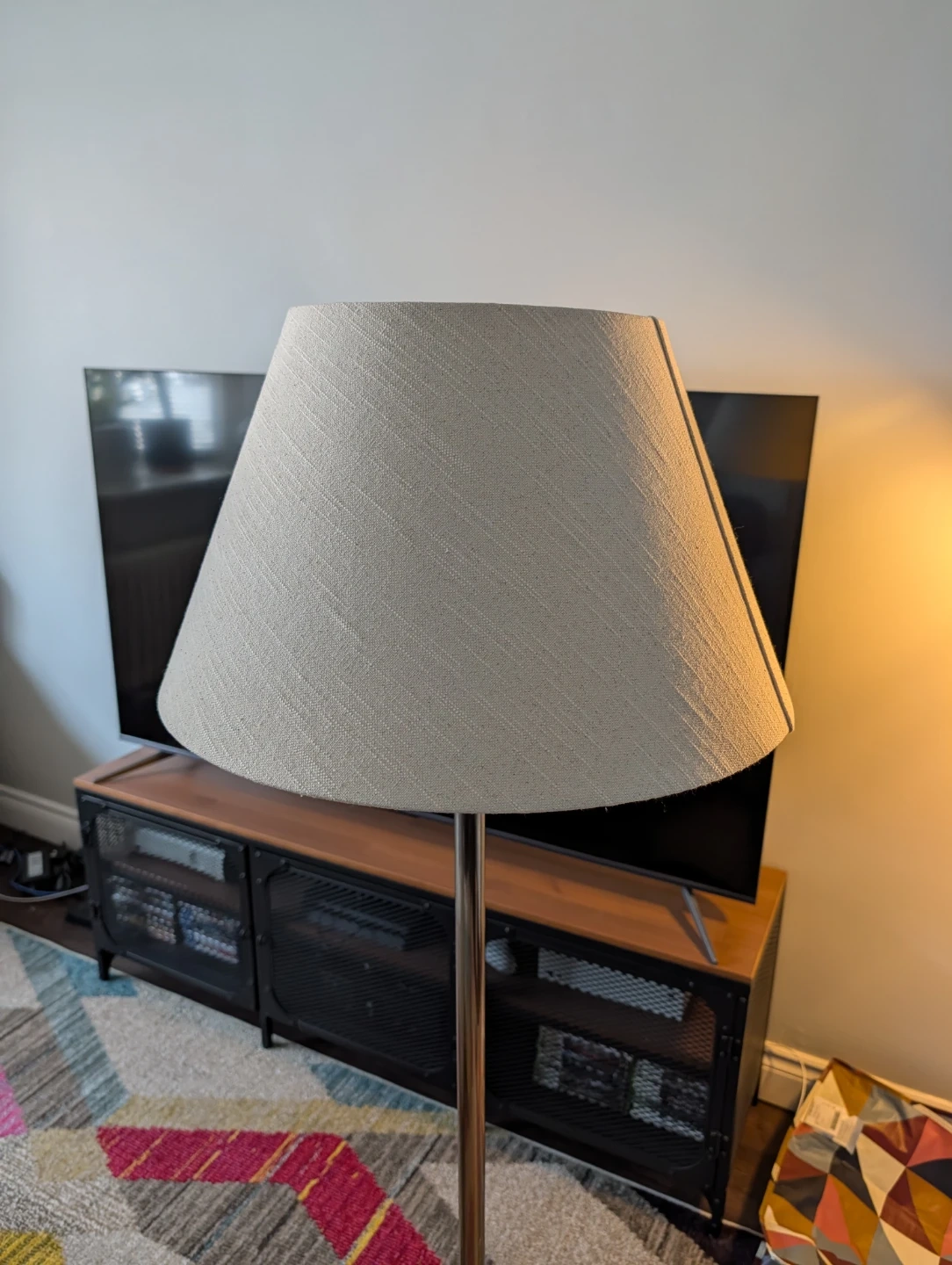 This floor lamp features a stylish drum shade and a very sturdy metal base. It has a dual-socket fixture for two bulbs. It's perfect for adding ambient lighting to any room. I lost the harp during moving so comes as is and you will need to buy one separately. The lower price reflects this.