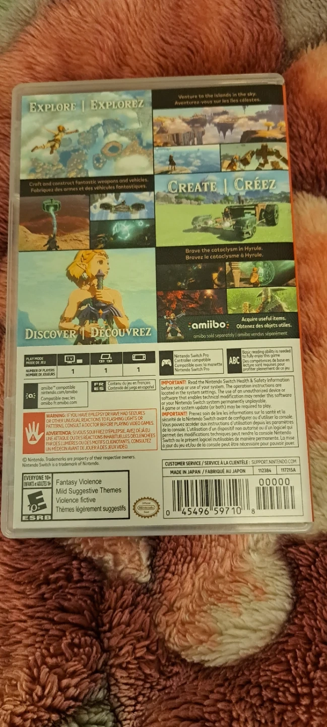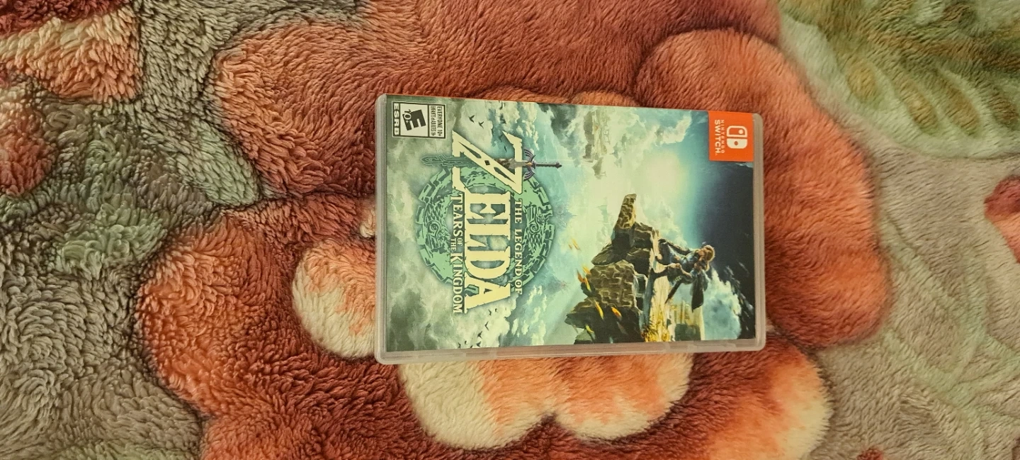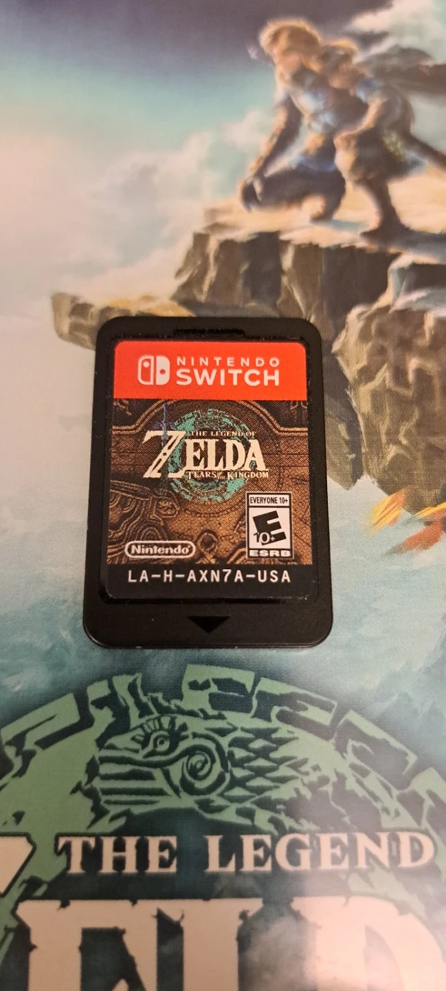 It's The Legend of Zelda: Tears of the Kingdom for Nintendo Switch. This game features exploration, crafting, and combat in the world of Hyrule. The rating is E for Everyone 10+ with Fantasy Violence and Mild Suggestive Themes.
