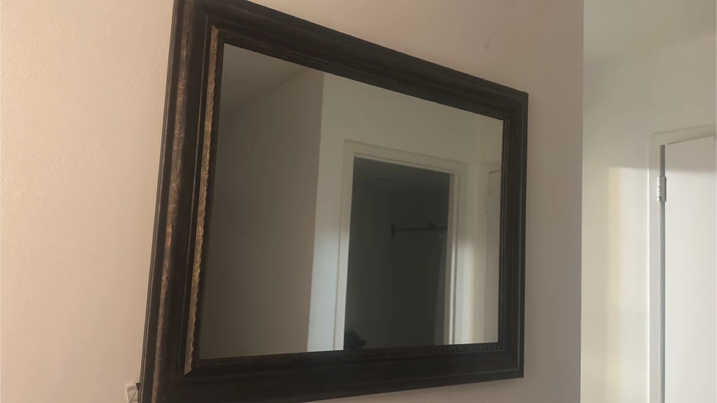 This is a wall mirror with an ornate dark frame. It's a good size for a bathroom or hallway. The frame has a distressed look with gold accents. It's ready to hang and would make a nice addition to any room!