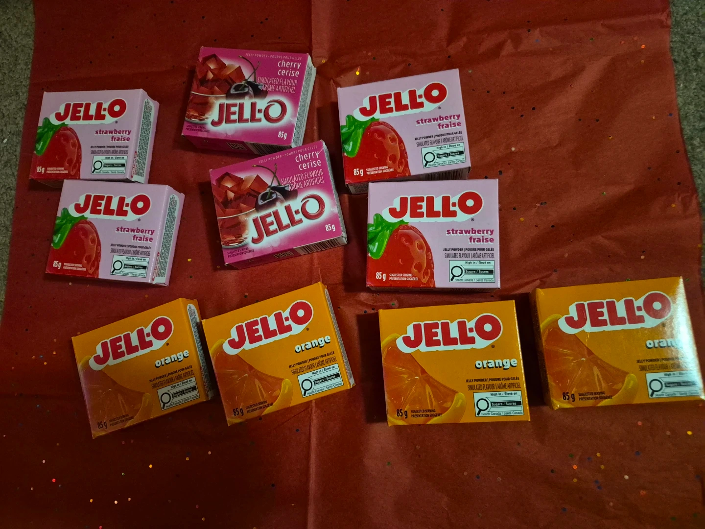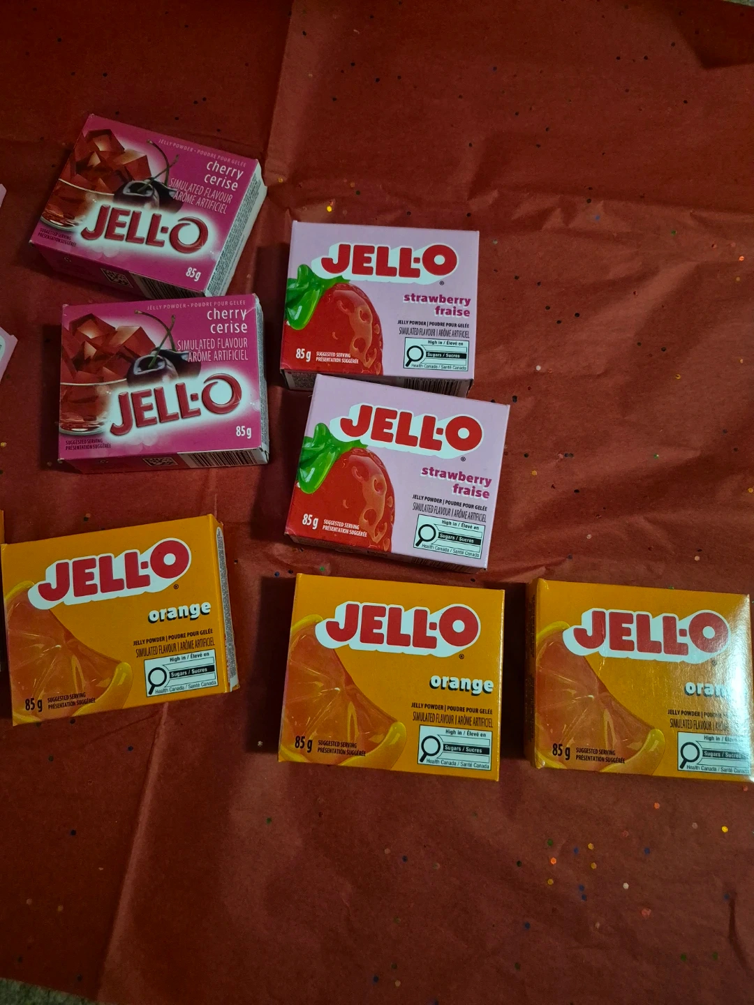 Jell-O instant pudding mix. Flavours are strawberry, cherry, and orange. Each box contains 85g of mix. Great for quick desserts!