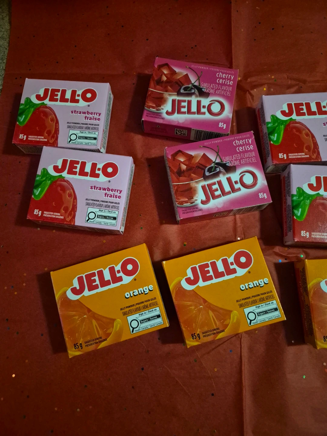 Jell-O instant pudding mix. Flavours are strawberry, cherry, and orange. Each box contains 85g of mix. Great for quick desserts!