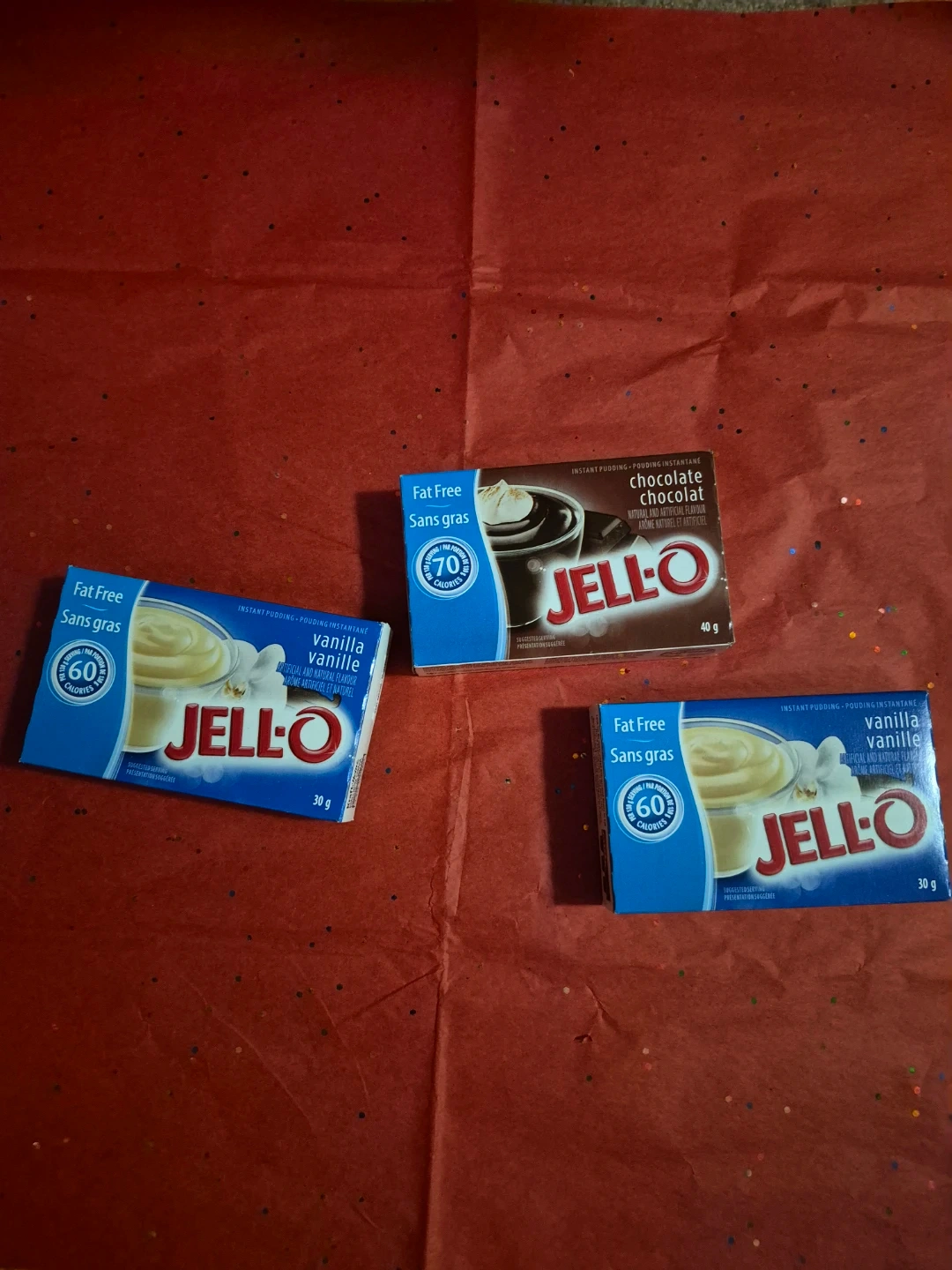 Two boxes of Jell-O vanilla instant pudding mix. One chocolate pudding. Each box contains 30g. This fat-free mix makes pudding with 60 calories per serving. Artificial and natural flavour.
