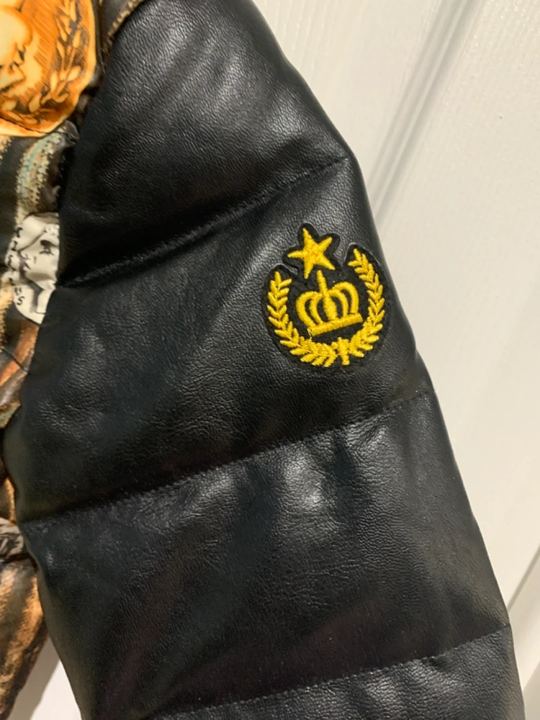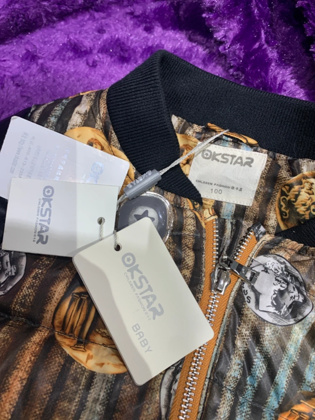 This KSTAR children's bomber jacket has a unique coin and scroll pattern on the body with black faux leather sleeves. It's a size 100. This jacket is perfect for keeping your little one warm and stylish during cooler weather!