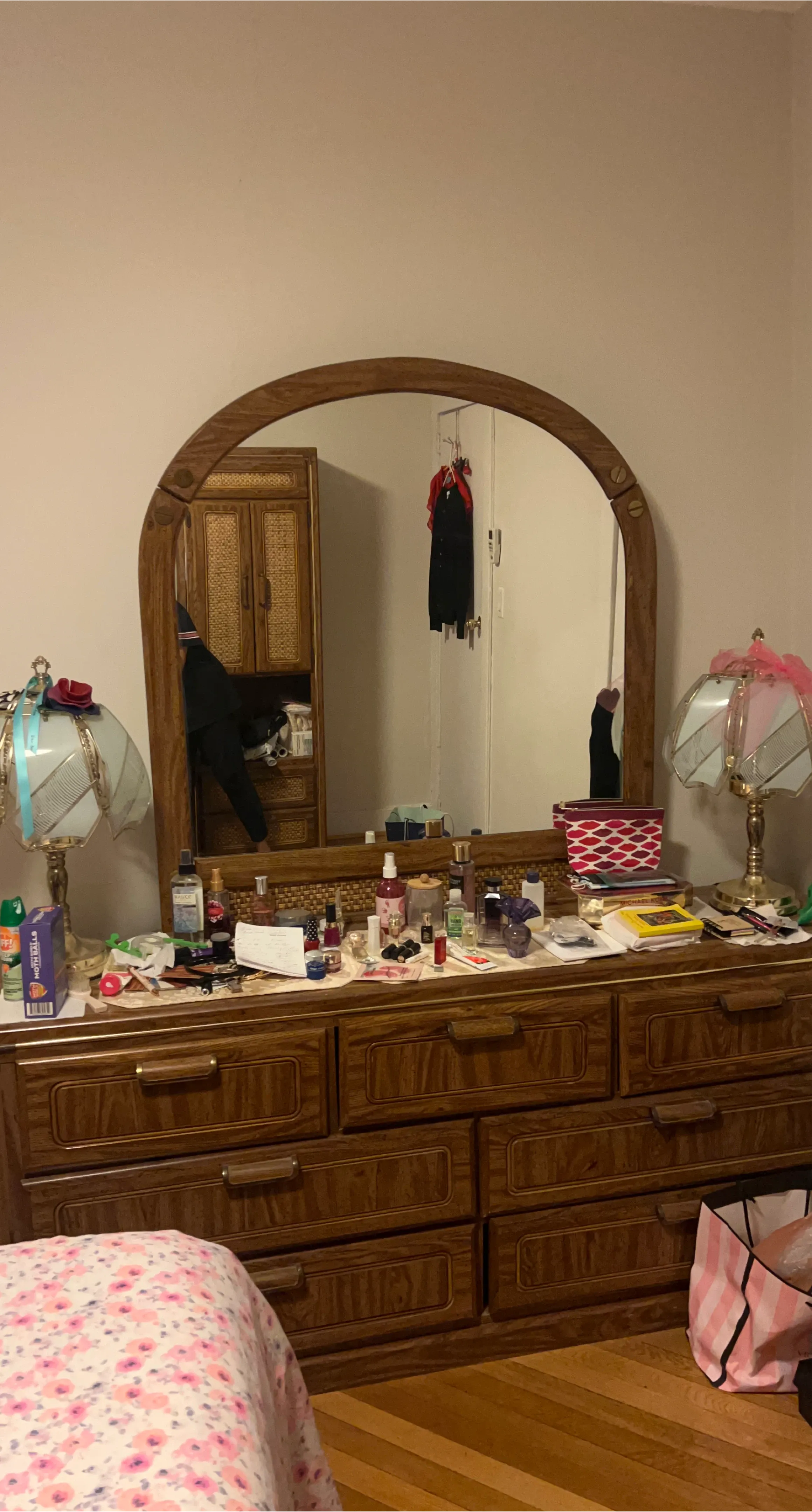 Wooden dresser with multiple drawers and a large arched mirror. It has ornate drawer pulls and a wood grain finish. There are also decorative lamps on either side. It's a substantial piece of bedroom furniture.