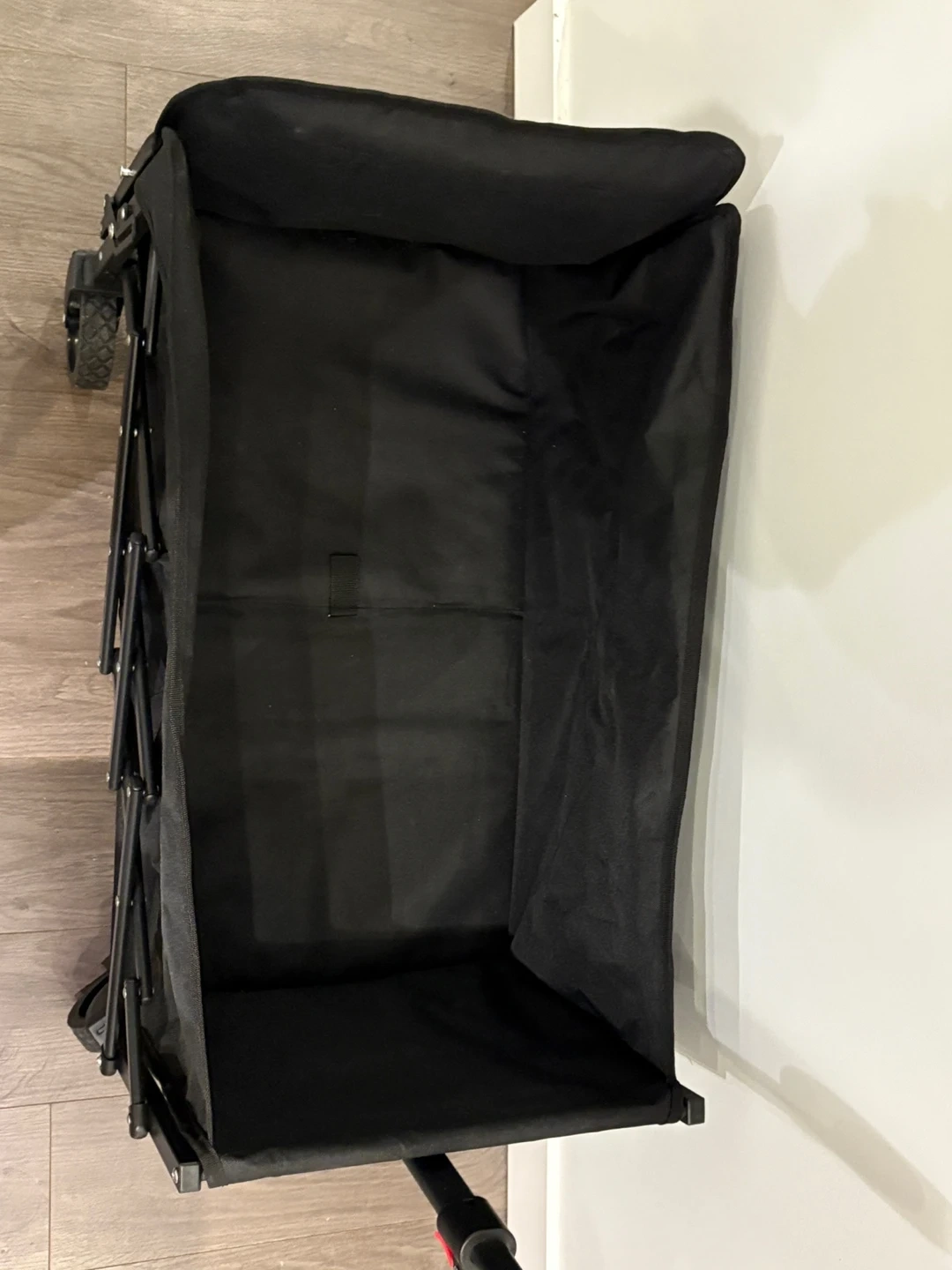 This VIC folding wagon is black and made of durable fabric. It features a collapsible frame for easy storage and transport. It's perfect for hauling gear to the park, beach, or sporting events.