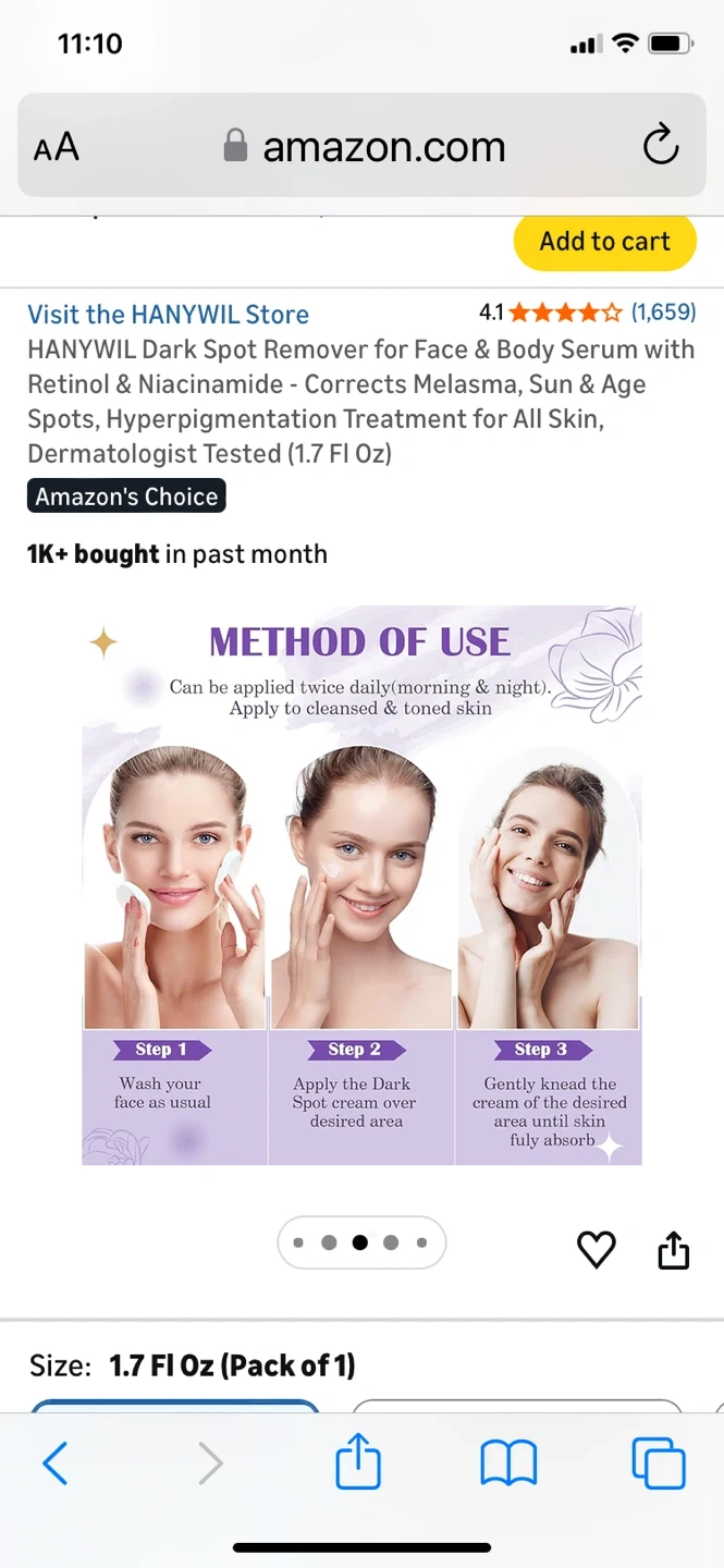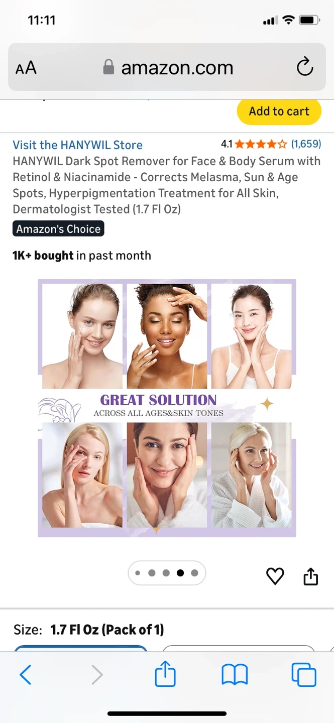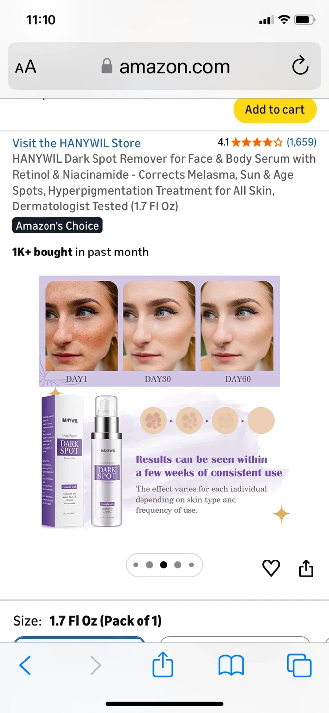 This Hanywil dark spot remover serum is formulated with Retinol & Niacinamide. It corrects melasma, sun & age spots, and hyperpigmentation for all skin types. Dermatologist tested, it comes in a 1.7 Fl Oz bottle. Results can be seen within a few weeks of consistent use!