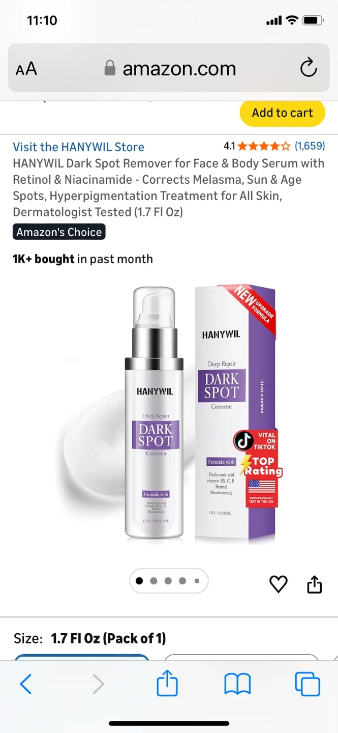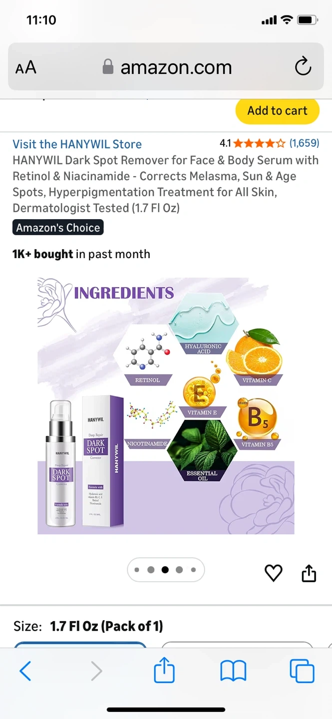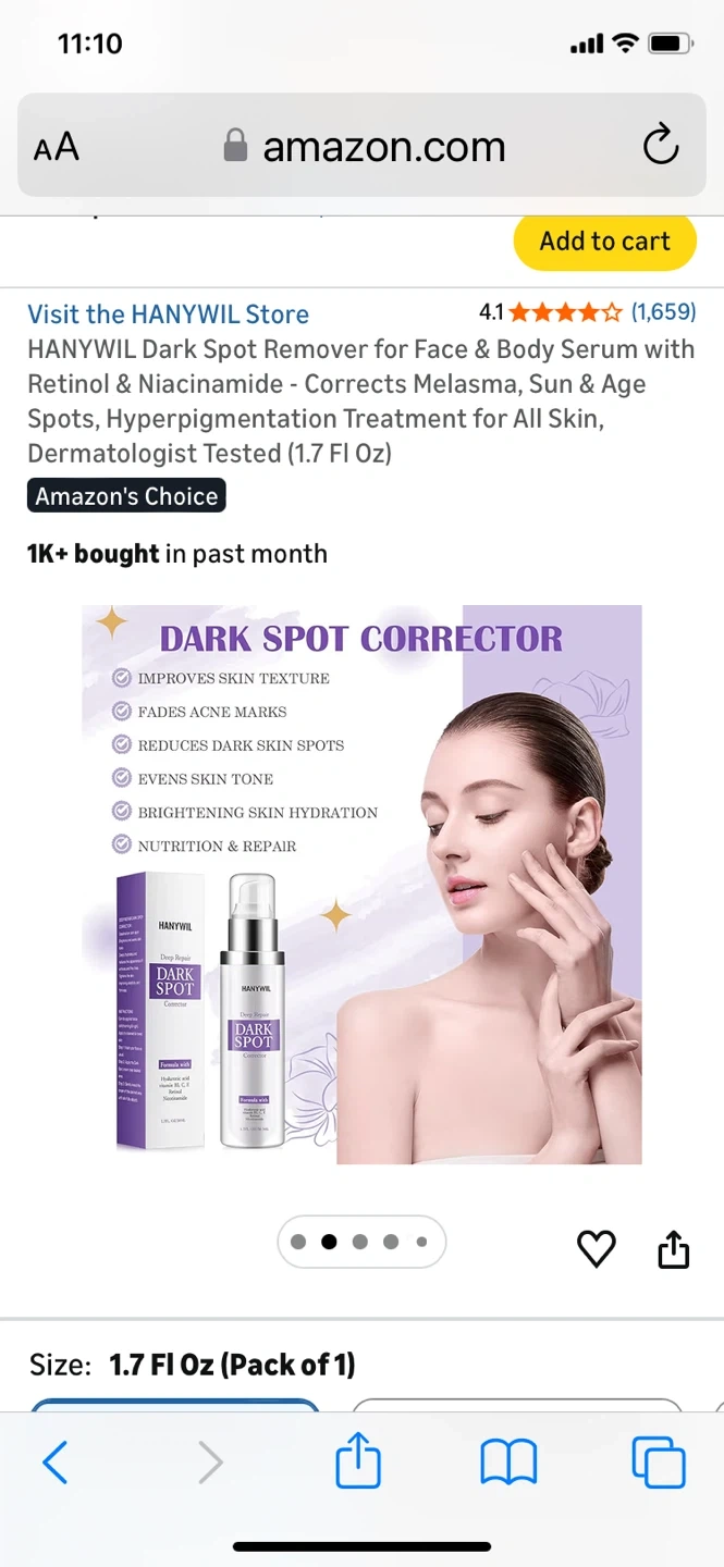 This Hanywil dark spot remover serum is formulated with Retinol & Niacinamide. It corrects melasma, sun & age spots, and hyperpigmentation for all skin types. Dermatologist tested, it comes in a 1.7 Fl Oz bottle. Results can be seen within a few weeks of consistent use!