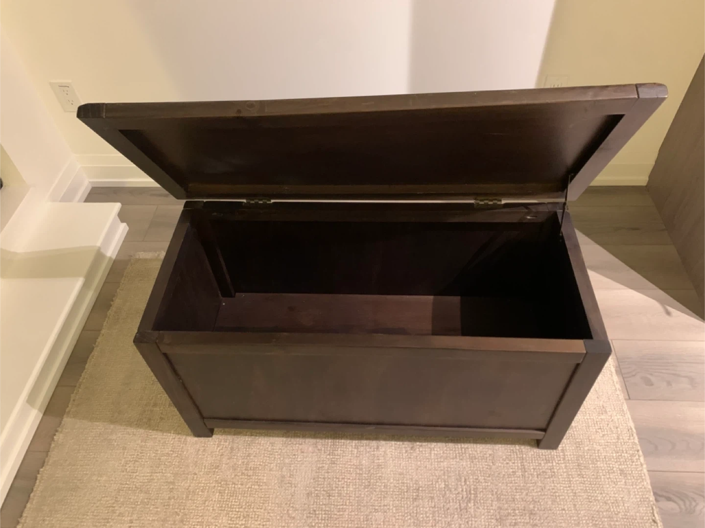 Dark wood finish storage chest with lift-top lid. Great for storing blankets, pillows, toys, shoes, or other household items. Can also be used as an entryway bench or extra seating.