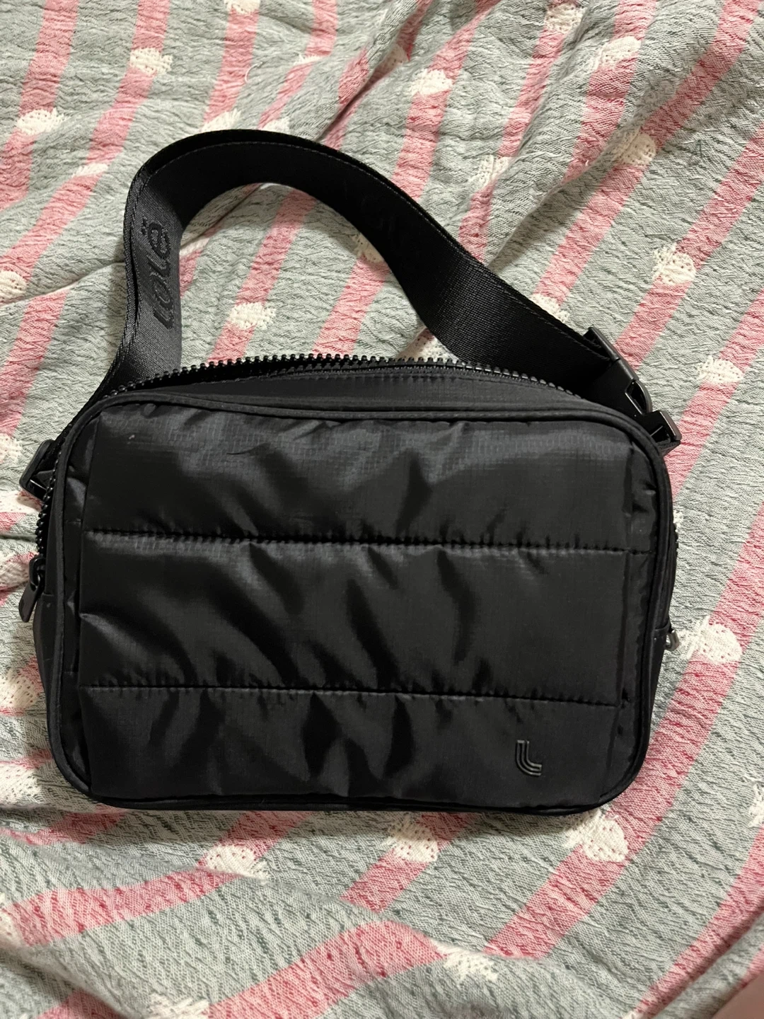 This black Lole belt bag is made from a puffer material. It has multiple interior pockets and an adjustable strap. It's great for keeping essentials organized on the go!