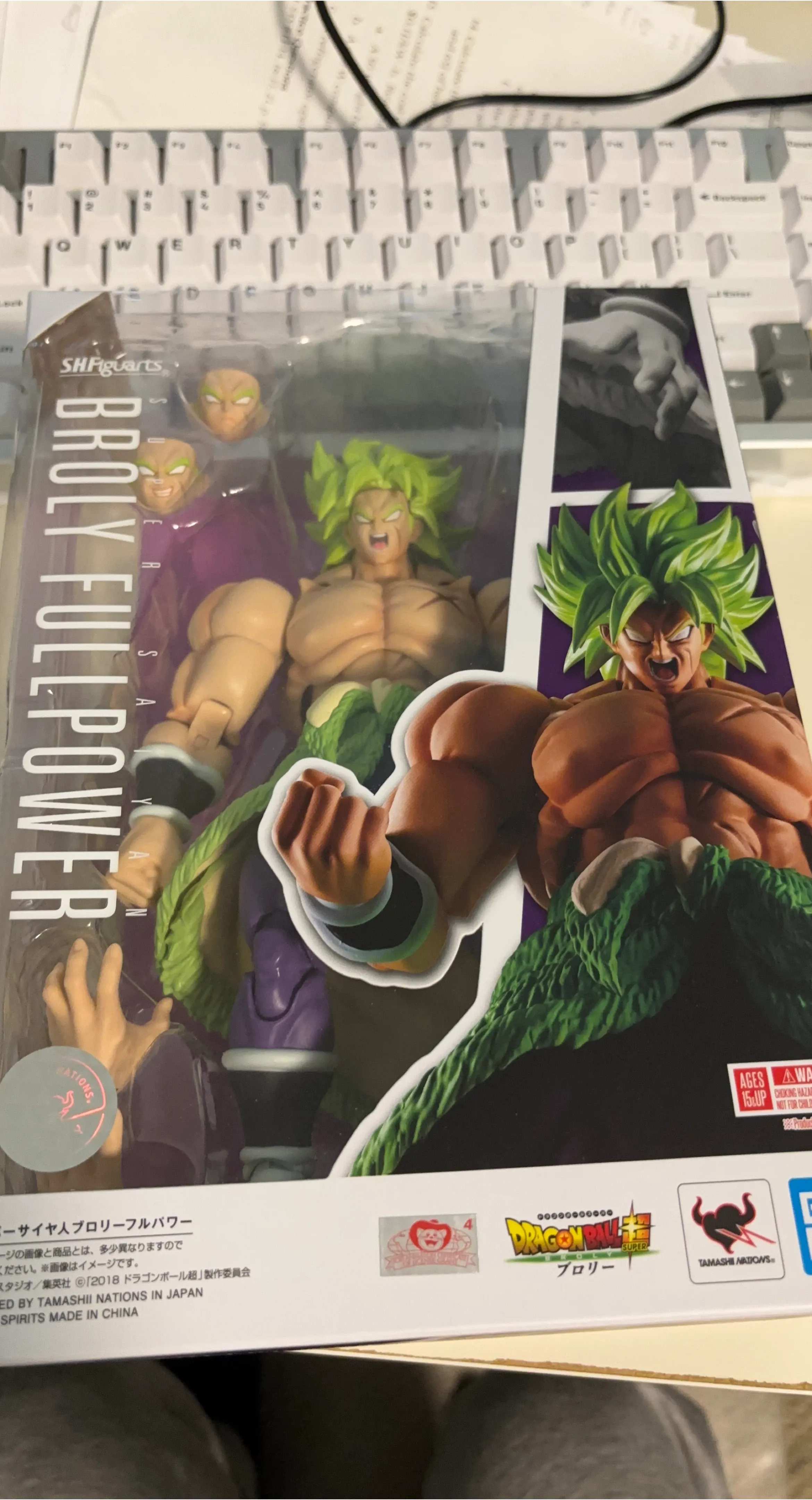 This is a SHFiguarts action figure of Broly in his Full Power form from Dragon Ball Super. The figure is made by Tamashii Nations in Japan. It's suitable for ages 15 and up.