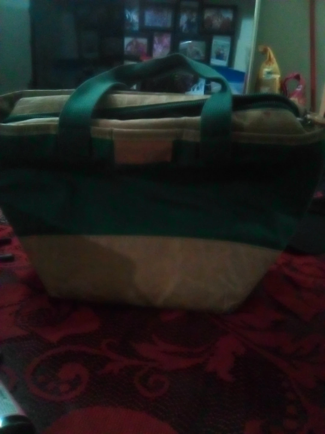 This insulated lunch bag has a zipper closure and two handles. It's made of durable fabric in a two-tone design. Perfect for carrying your lunch.