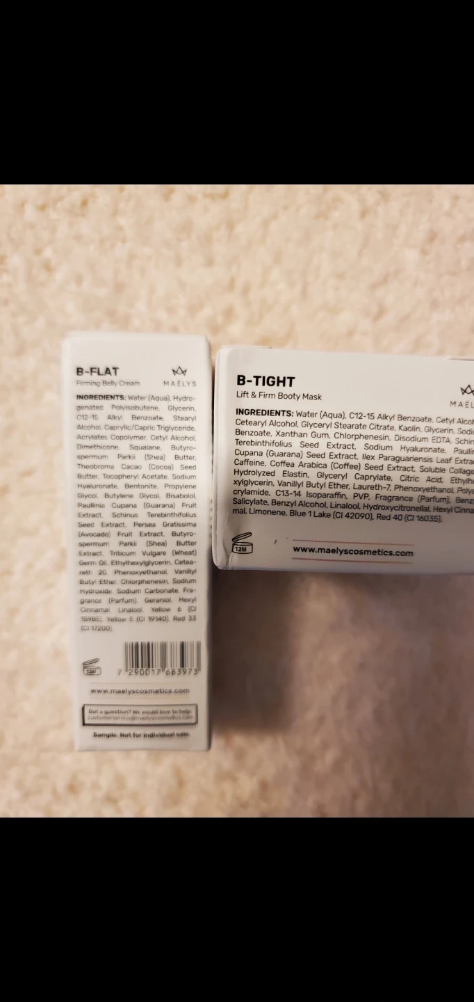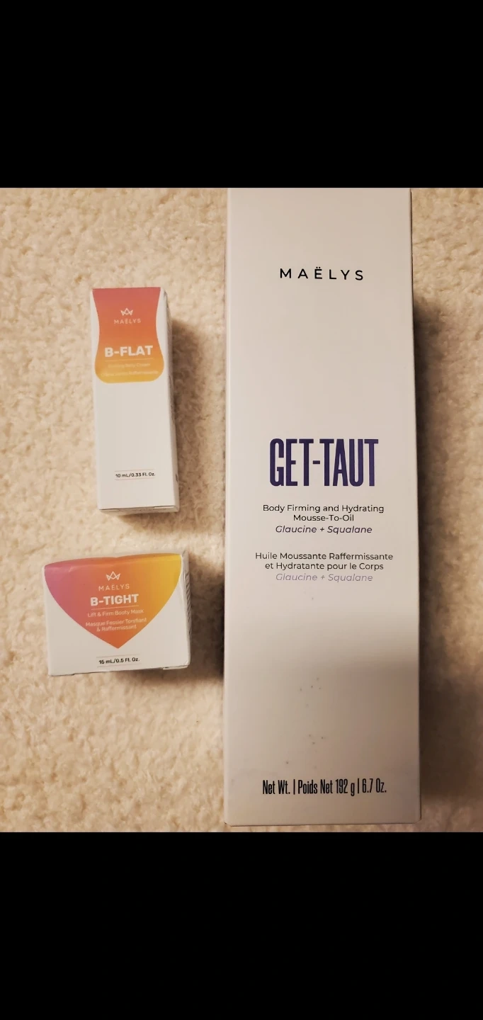 This set includes the MAELYS B-FLAT Firming Belly Cream (192g / 6.7 oz) and the MAELYS B-TIGHT Lift & Firm Booty Mask (15 mL / 0.5 Fl. Oz.). They're designed for skin firming and hydration.