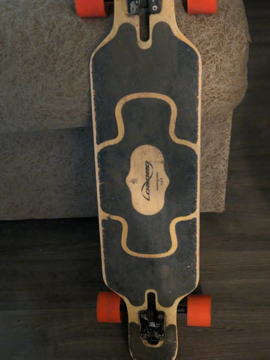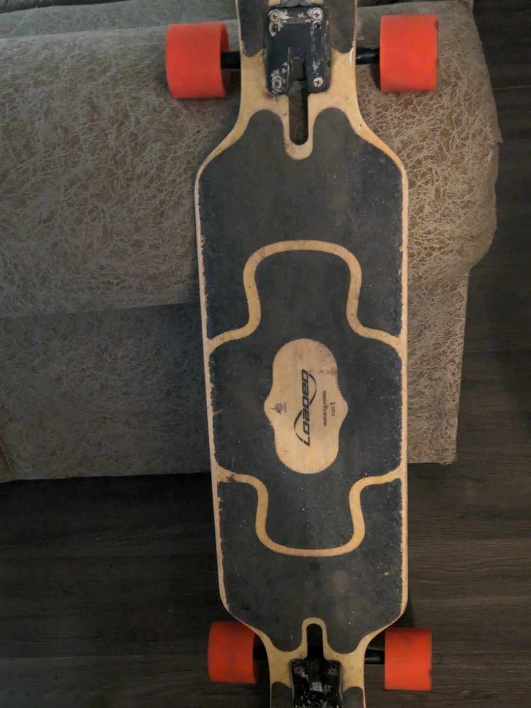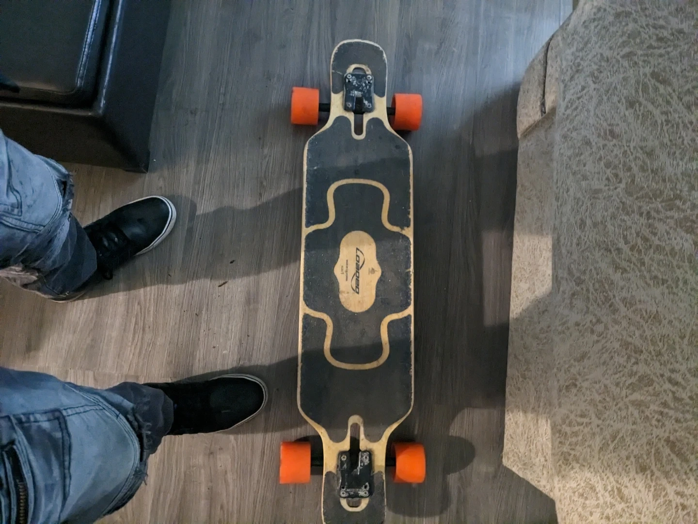 This is a Loaded longboard skateboard with bright orange wheels. It's designed for cruising and downhill riding. The deck features a distinctive graphic and grip tape for traction. It's great for getting around town or hitting some slopes!