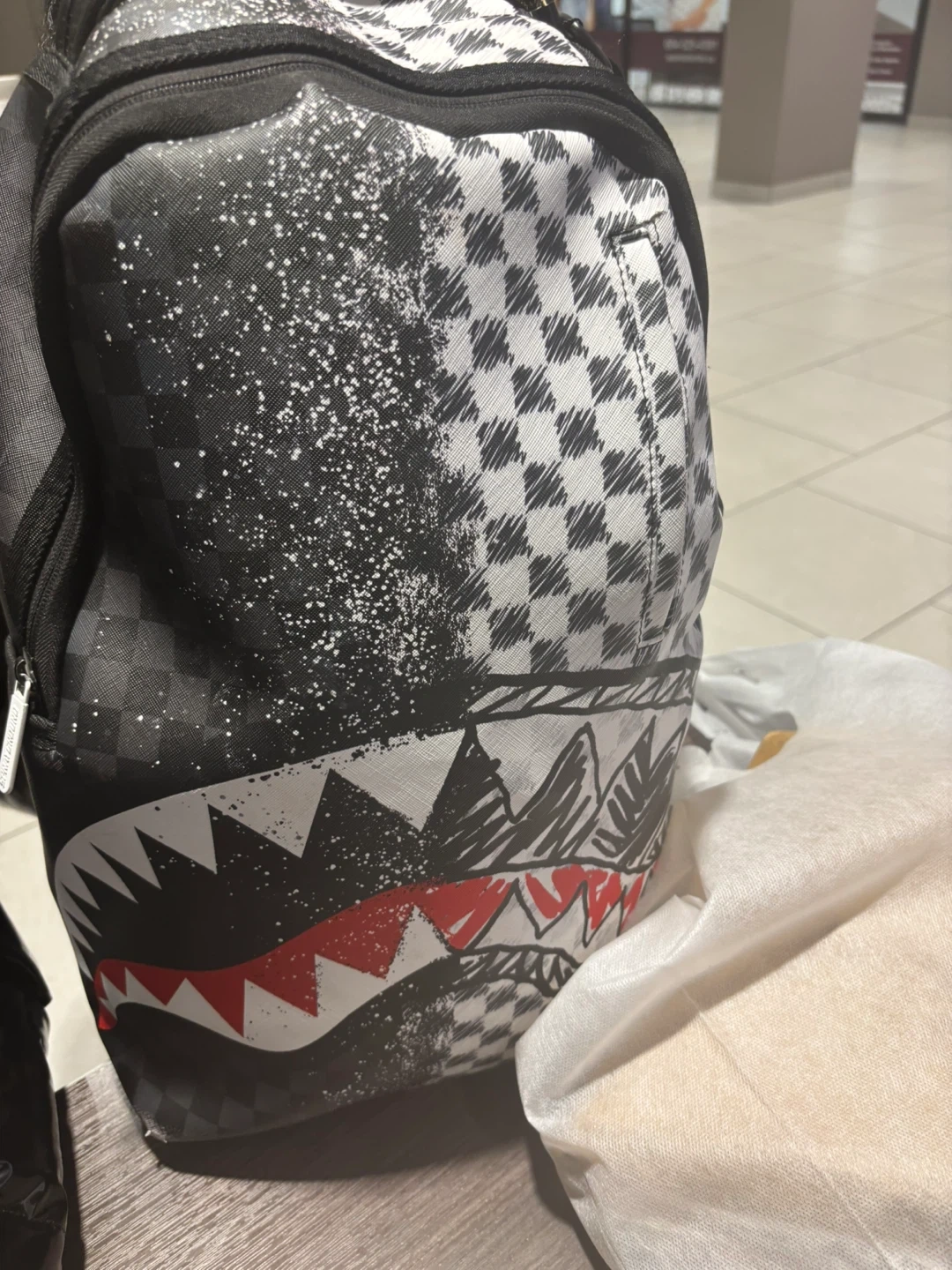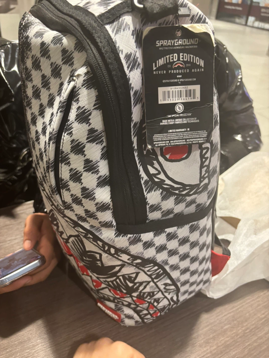 Sprayground backpack with a limited edition "Never Produced Again" design. Features a black and white checkerboard pattern with a shark mouth graphic. It has multiple compartments for storage.
