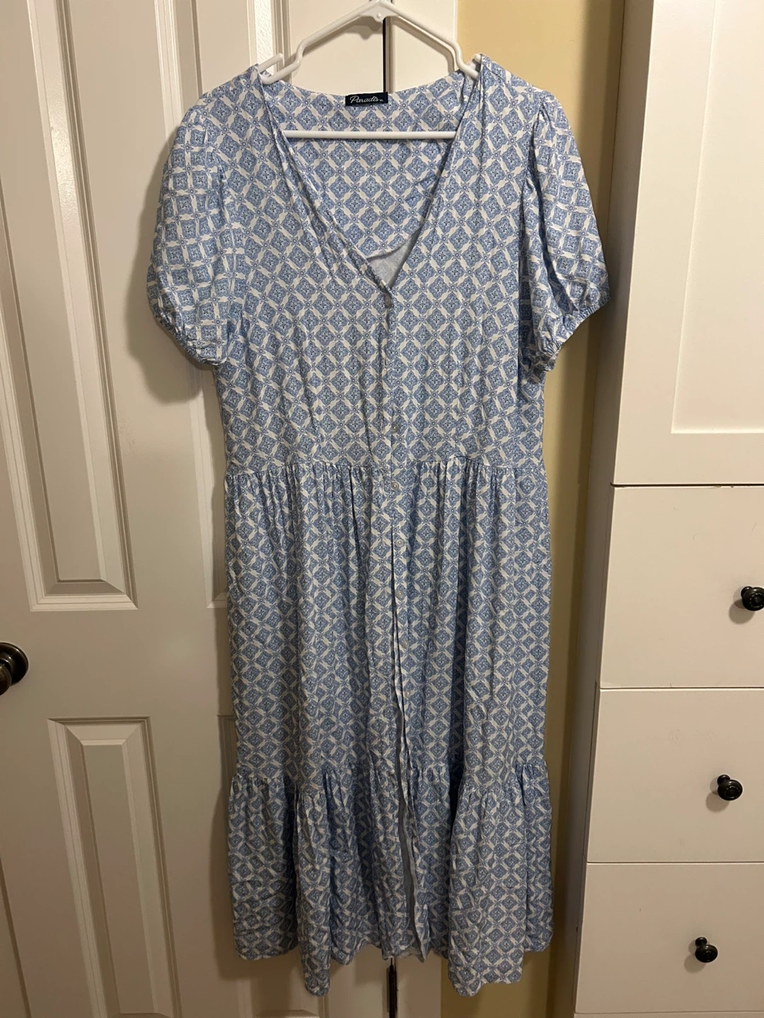 This Paradis maxi dress features a lovely blue and white geometric print. It has a flattering V-neckline and a button-front detail. The dress is a size XL.