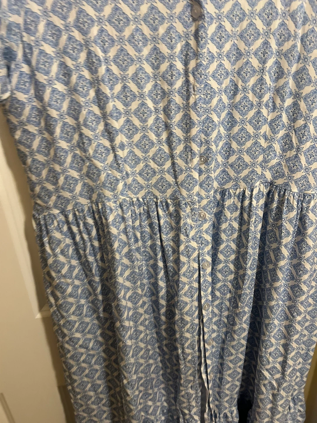 This Paradis maxi dress features a lovely blue and white geometric print. It has a flattering V-neckline and a button-front detail. The dress is a size XL.