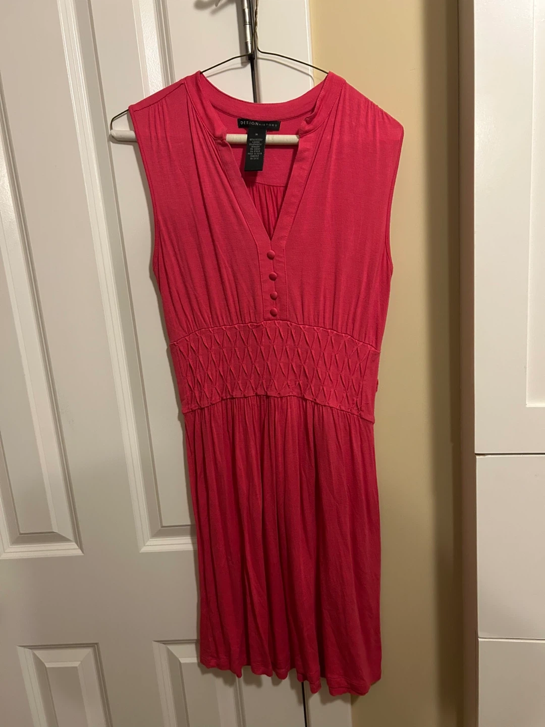This sleeveless pink dress from DESIGN HISTORY features a flattering V-neck with button details and a smocked waist. Made with a blend of 95% viscose and 5% spandex for comfort and stretch. It's a versatile piece perfect for everyday wear!