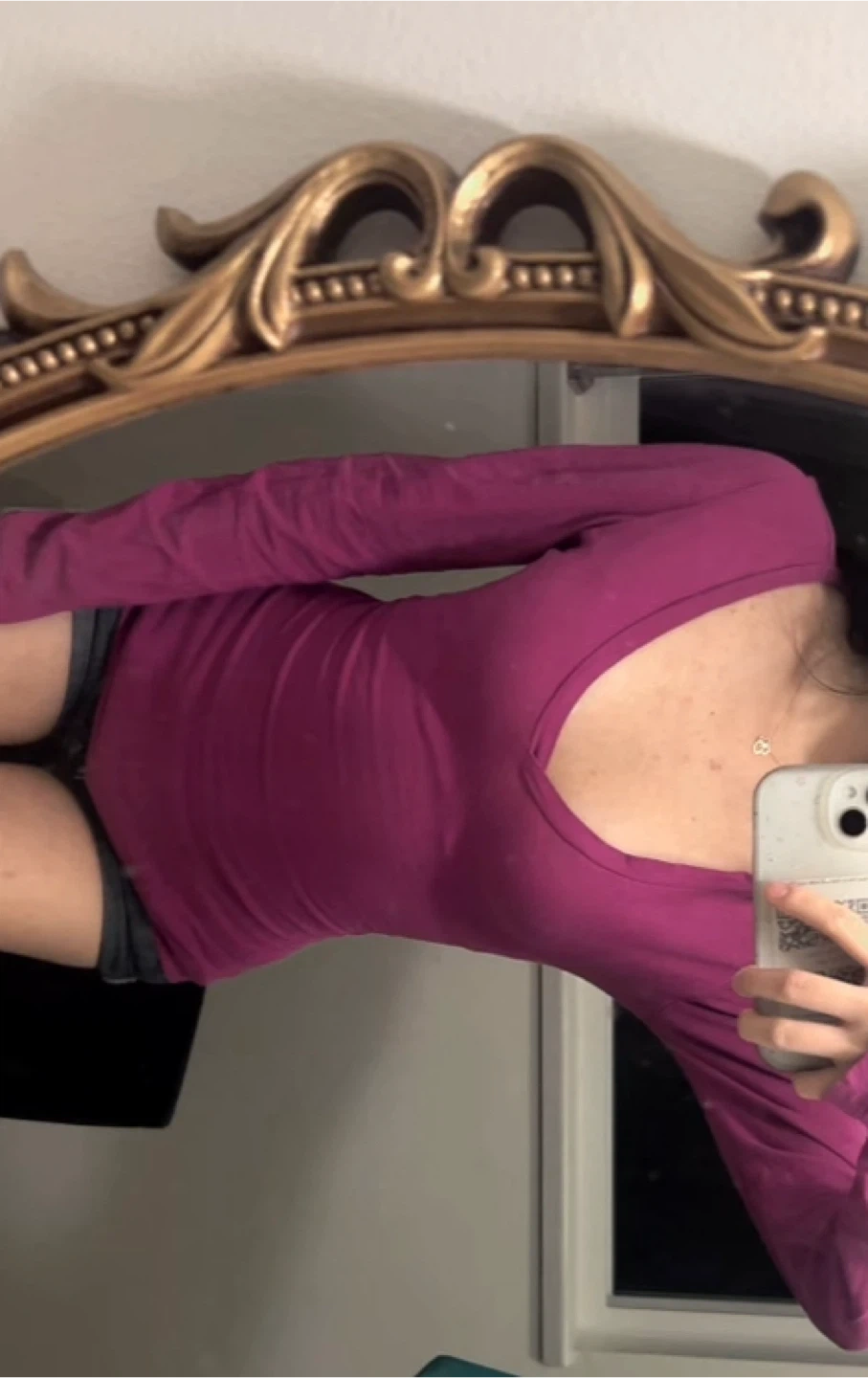 A comfortable, long-sleeved v-neck top in a vibrant magenta colour. It's made from a soft, stretchy material for a great fit. This top is perfect for layering or wearing on its own, especially with a lace cami!