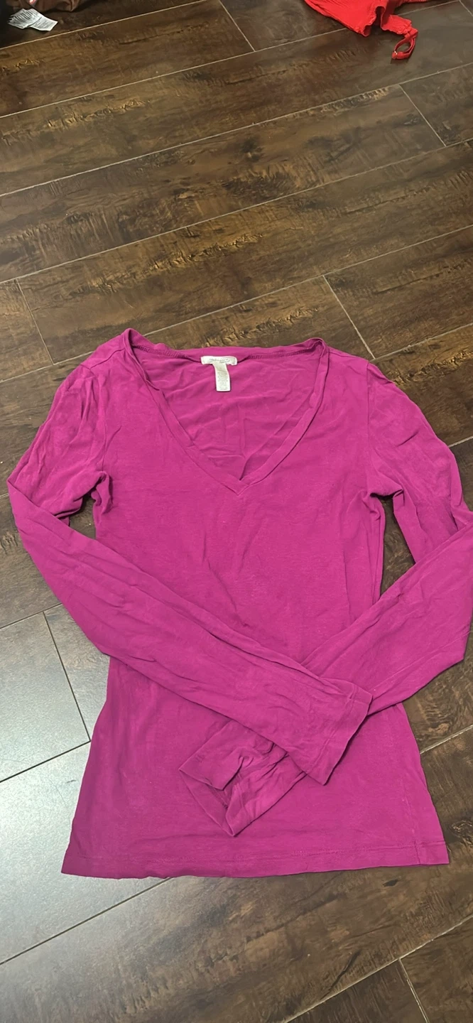 A comfortable, long-sleeved v-neck top in a vibrant magenta colour. It's made from a soft, stretchy material for a great fit. This top is perfect for layering or wearing on its own, especially with a lace cami!