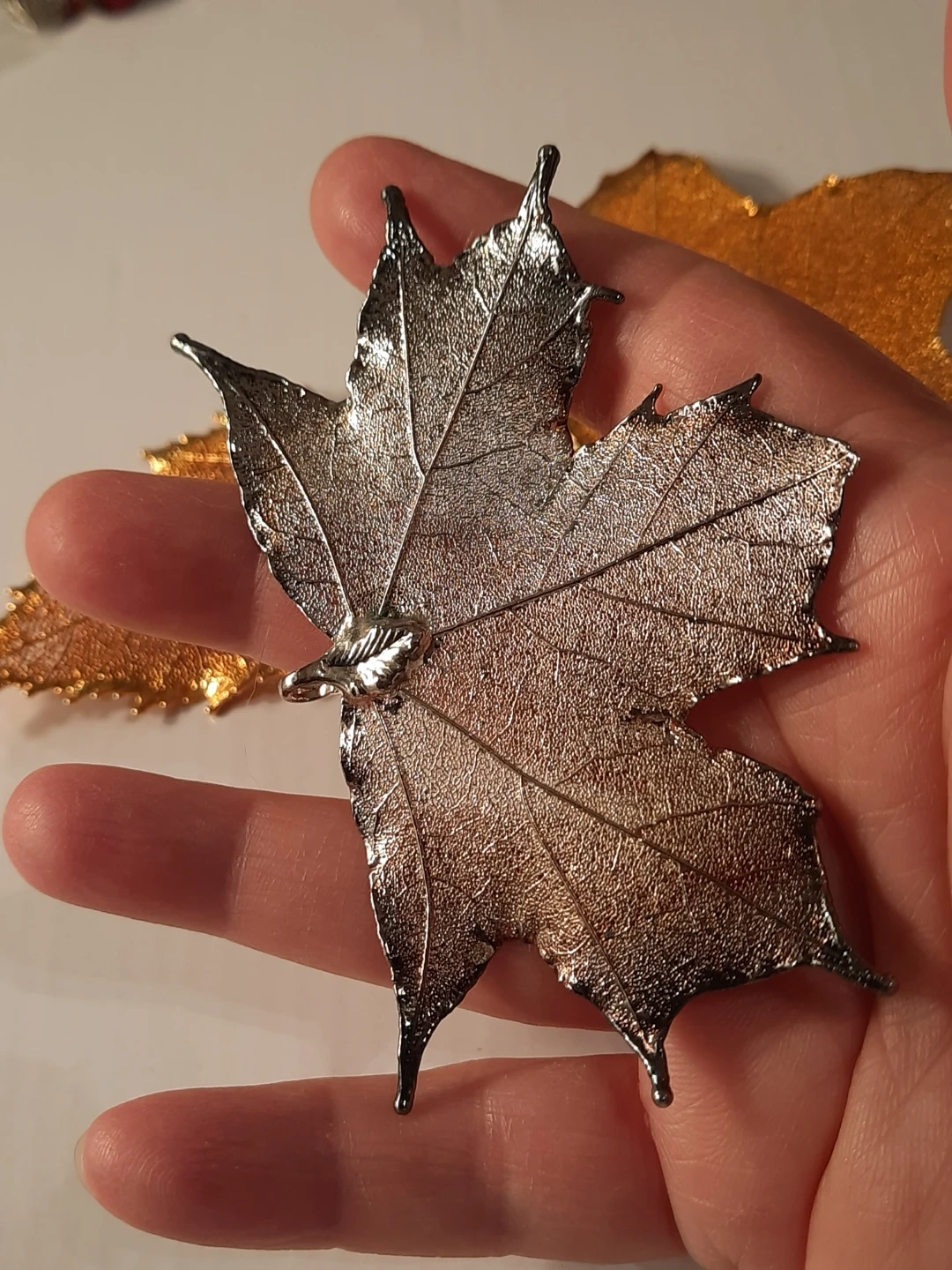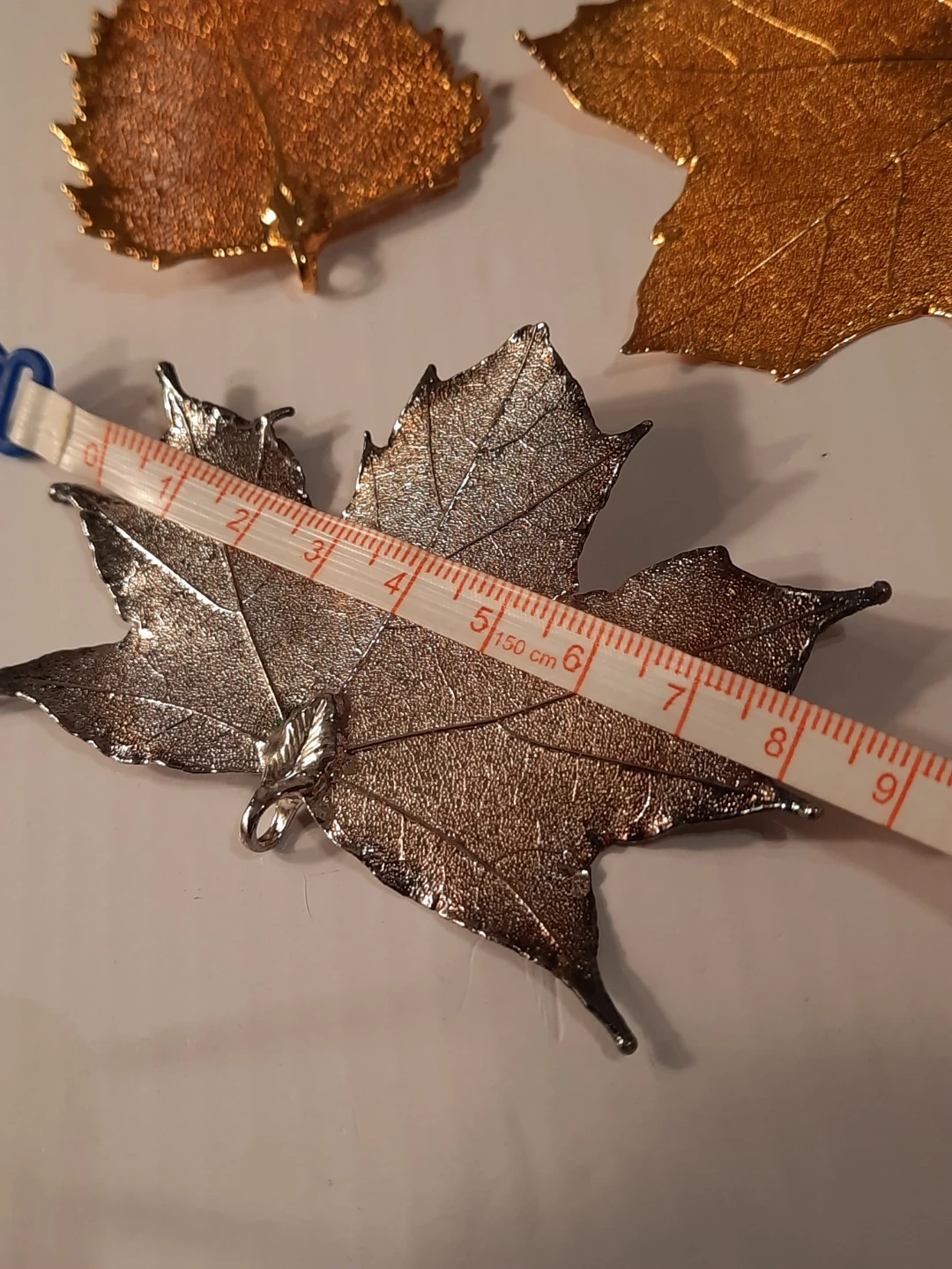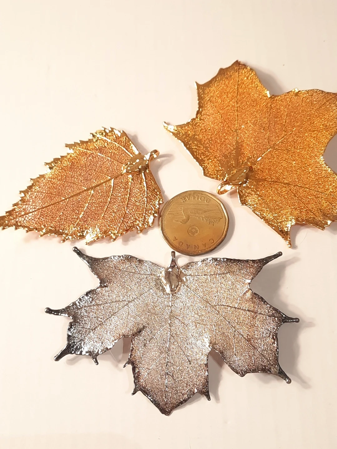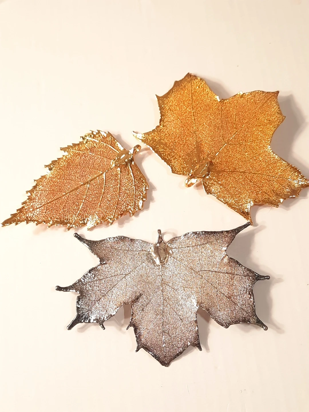 Three beautiful fall leaf pendants or ornaments, perfect for seasonal decor. Includes two gold leaves and one silver maple leaf. These add a lovely touch to any autumn display!just add a chains to them.