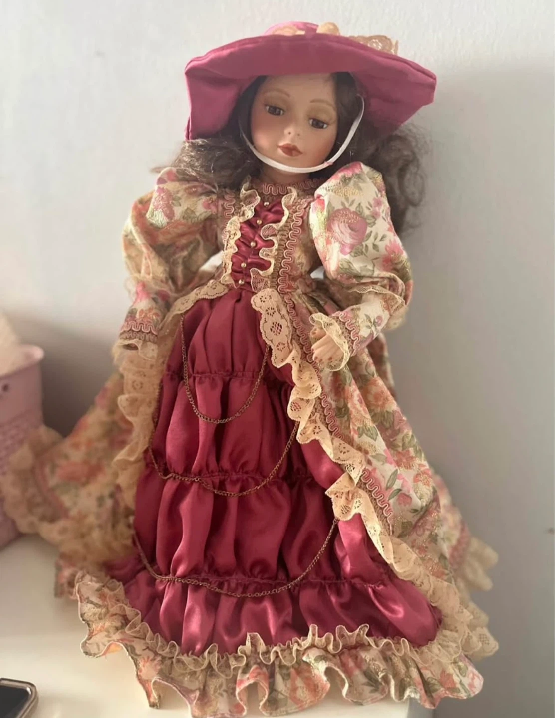 This decorative porcelain doll is dressed in a floral print gown with a ruffled pink hat. It features intricate lace trim and gold chain detailing on its dress. A lovely display piece for any collector!