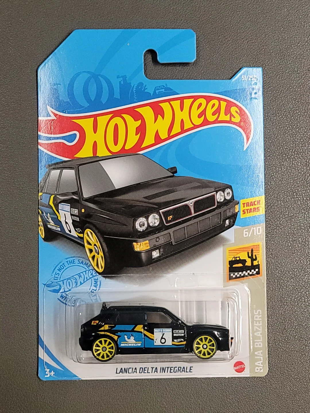 It's a Hot Wheels die-cast model of the Lancia Delta Integrale. It's part of the Baja Blazers series and features a black finish with blue and yellow decals. This model is 6/10 in the series.