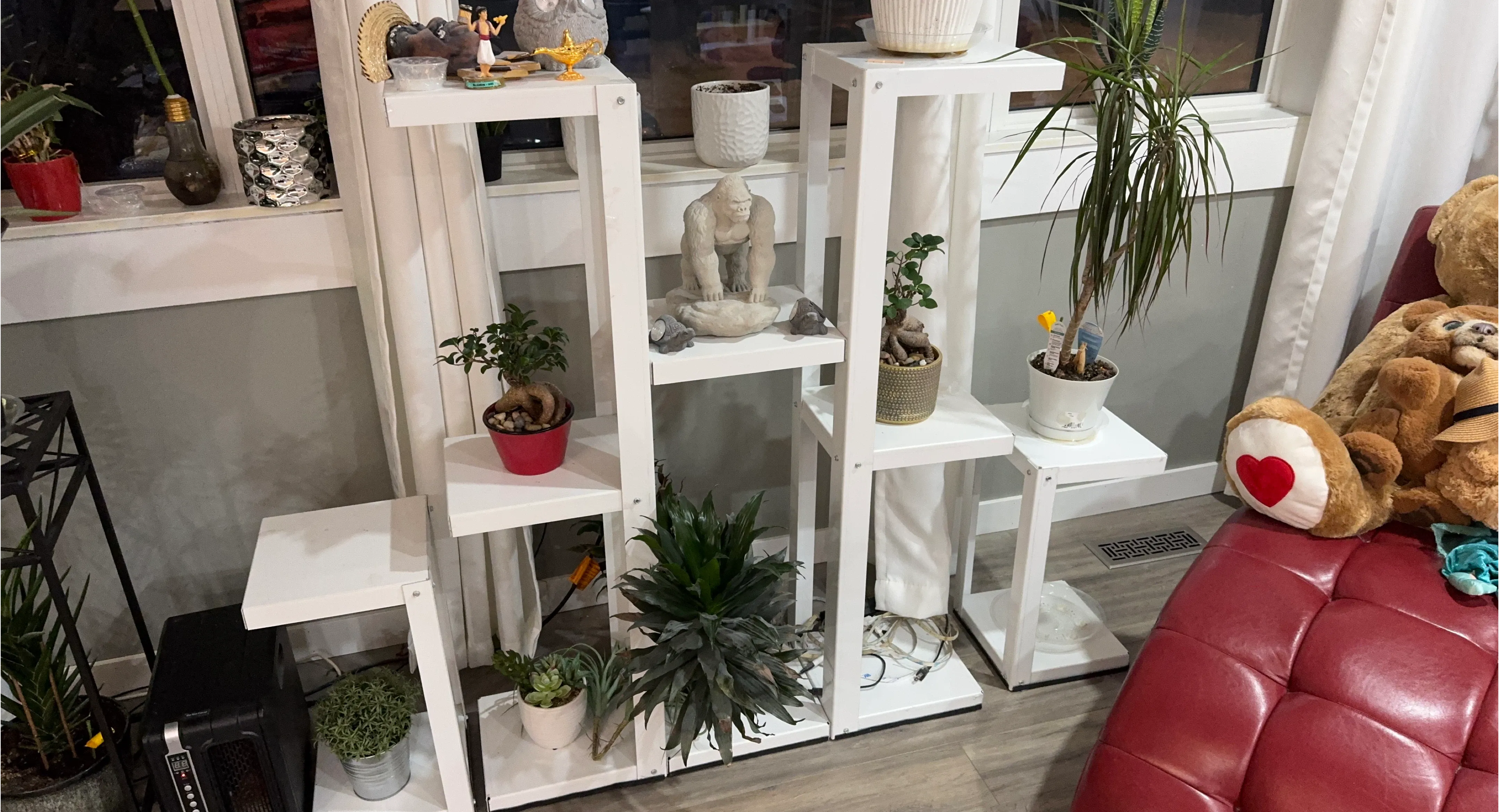 White metal solid tiered plant stand with multiple levels. It's great for displaying plants indoors or outdoors. This large stand is made of metal! Plants not included.