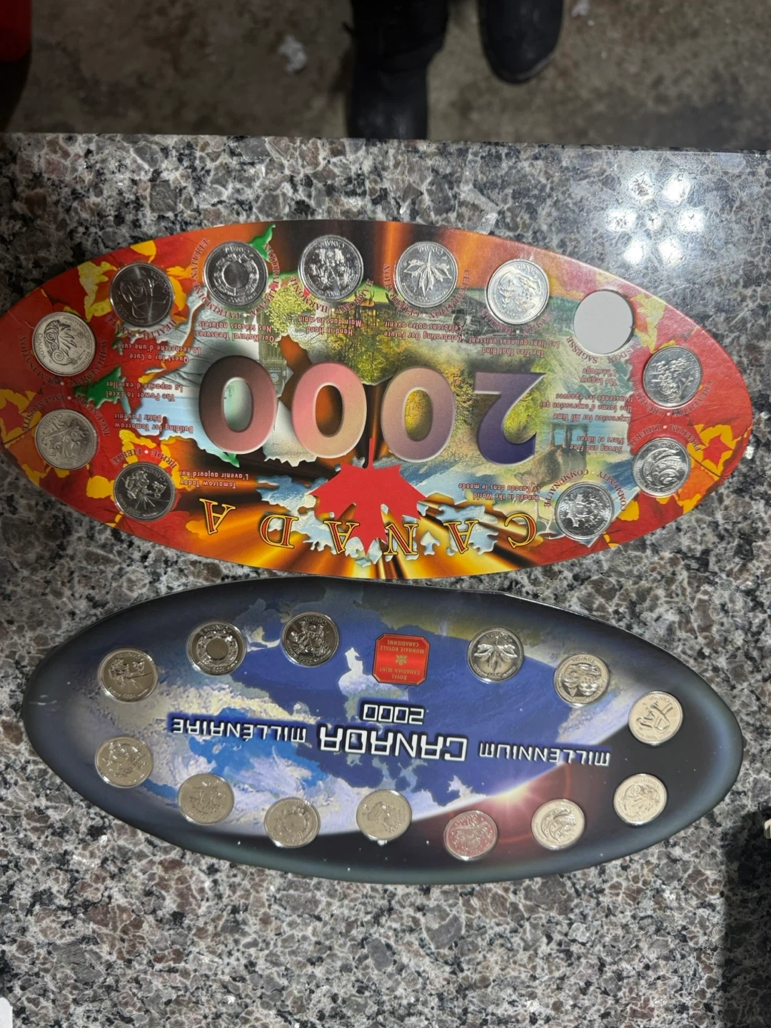 This is a collection of Canadian Millennium coins from the year 2000. It features coins from various denominations, celebrating Canada's turn of the millennium. The set includes a display showcasing the coins and their significance. Found them in my grandmas basement. Price is based off similar listings. 1 is missing in orange set they were in plastic before .