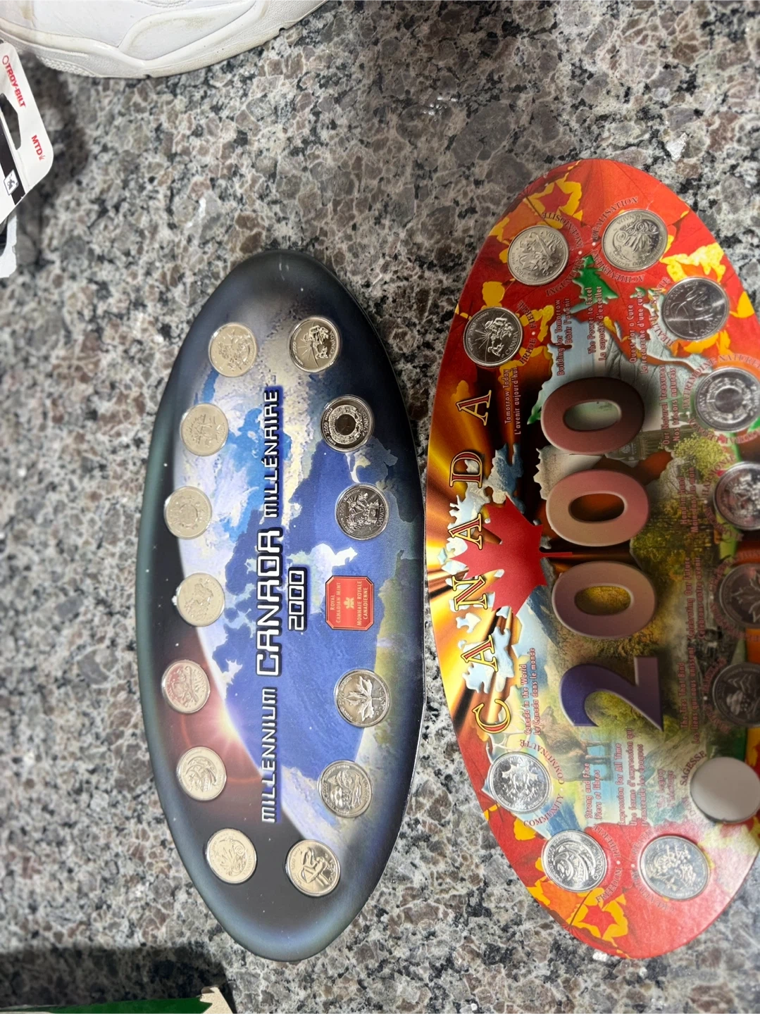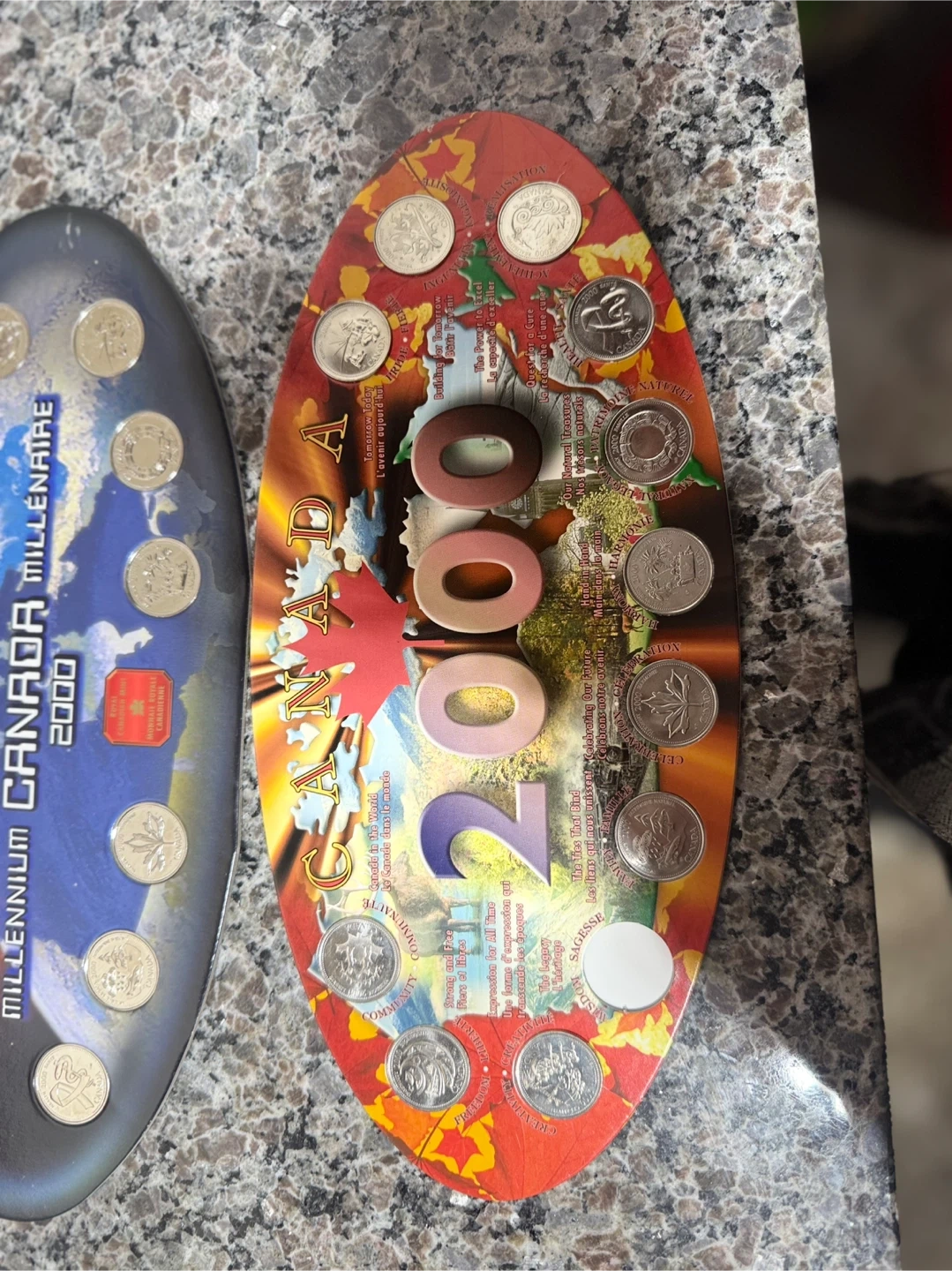 This is a collection of Canadian Millennium coins from the year 2000. It features coins from various denominations, celebrating Canada's turn of the millennium. The set includes a display showcasing the coins and their significance. Found them in my grandmas basement. Price is based off similar listings. 1 is missing in orange set they were in plastic before .