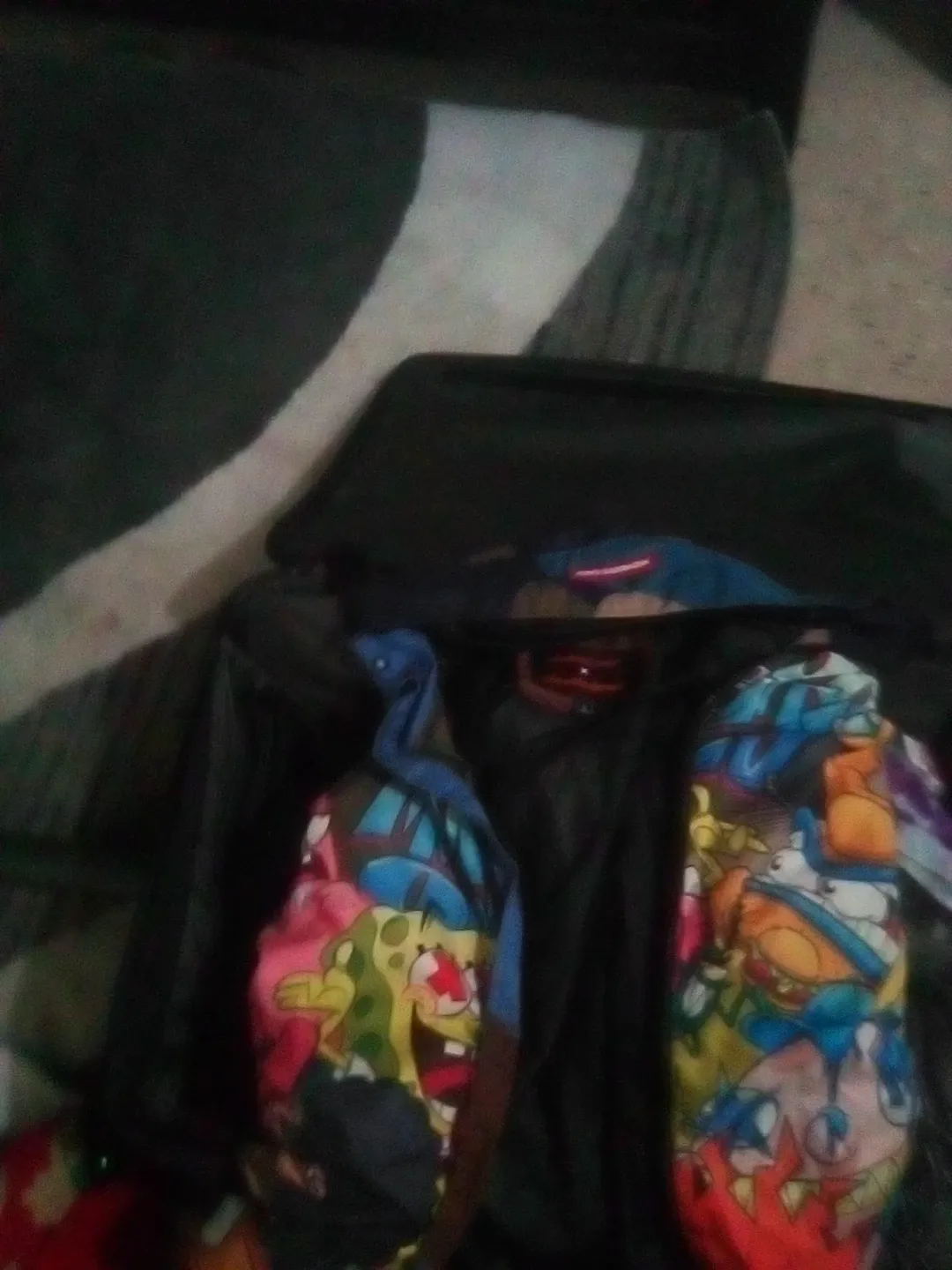 This black jacket features a vibrant graphic print with characters from SpongeBob SquarePants and Sonic the Hedgehog. It's a fun and eye-catching piece for any fan. A unique jacket with playful character designs!