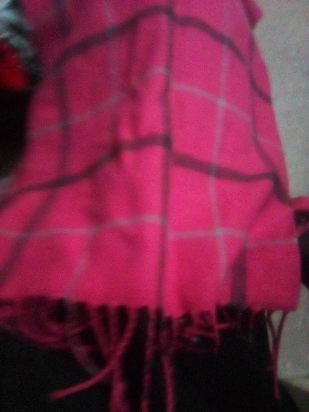 This scarf features a vibrant pink color with a classic plaid pattern. It has a fringed edge for added detail. Its material appears soft and warm.