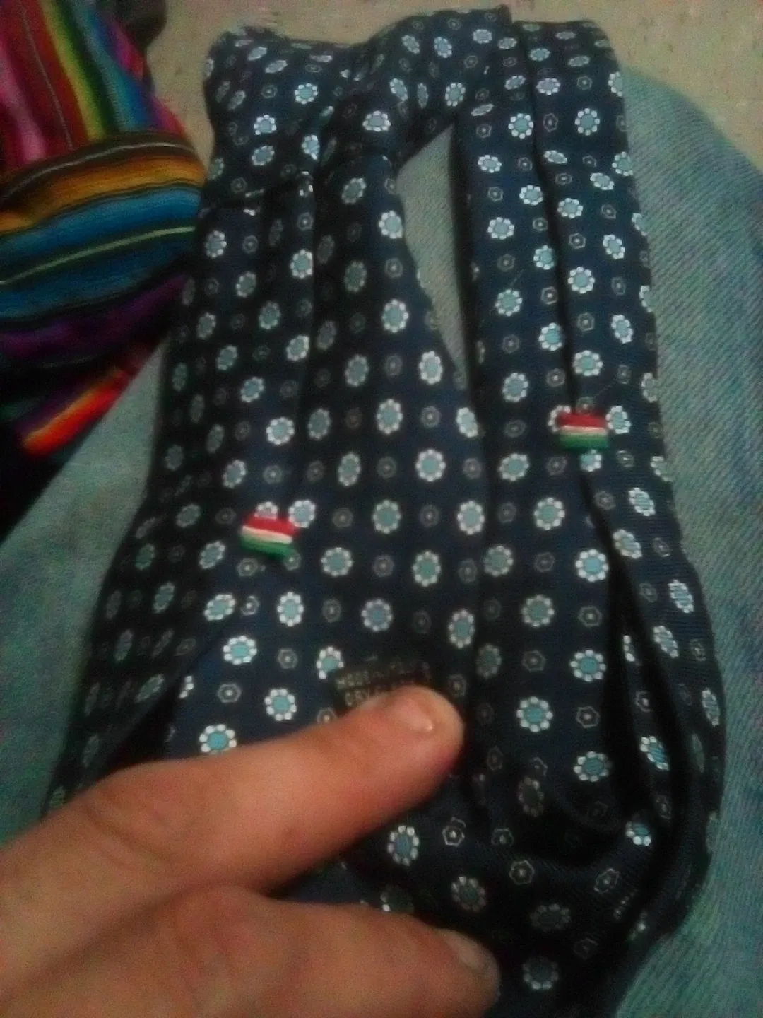 This is a dark blue necktie featuring a repeating pattern of white and light blue floral designs. It's made from silk. The tie has a small Italian flag accent near the knot. It's a classic accessory for formal or business attire!