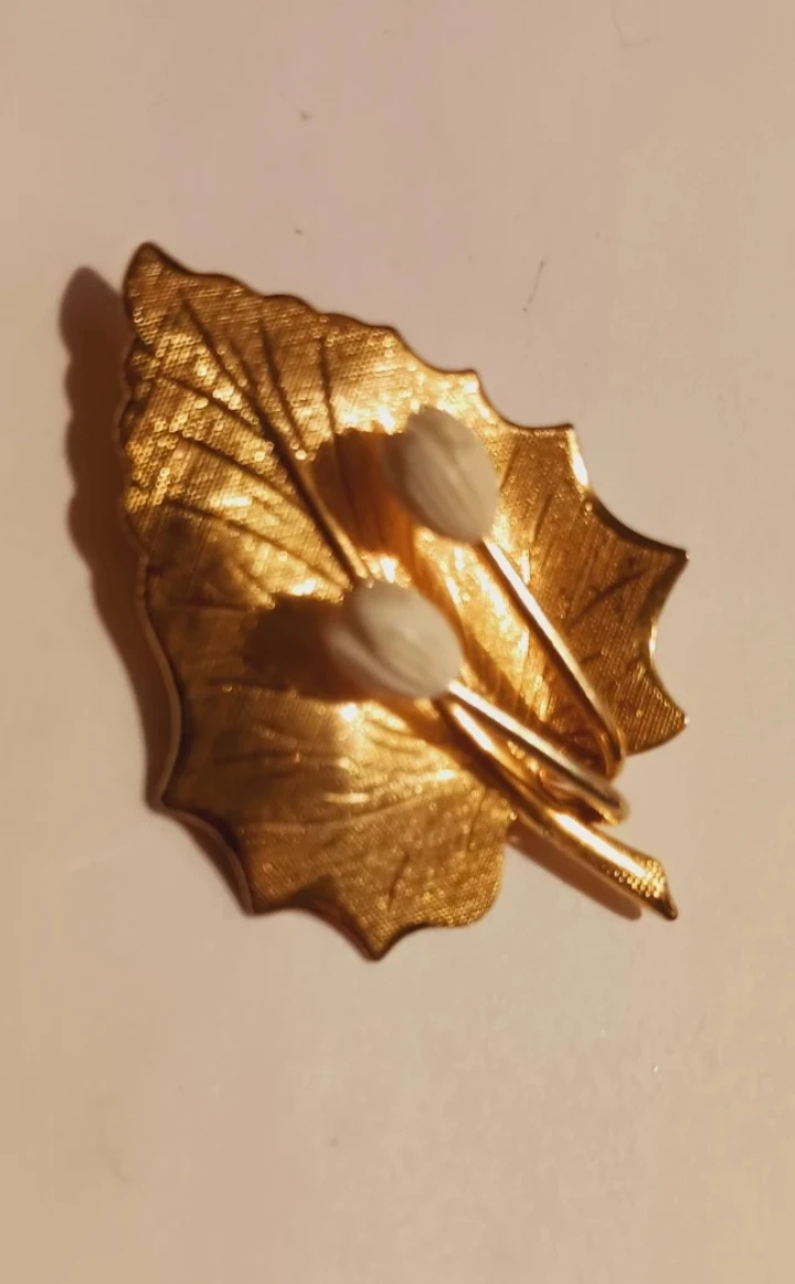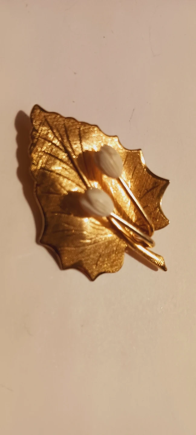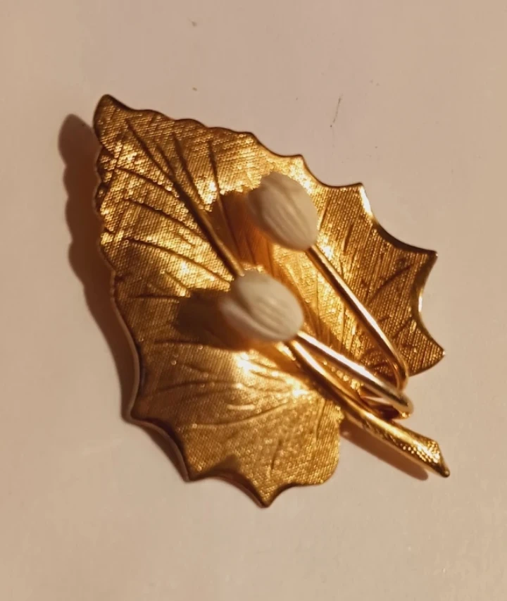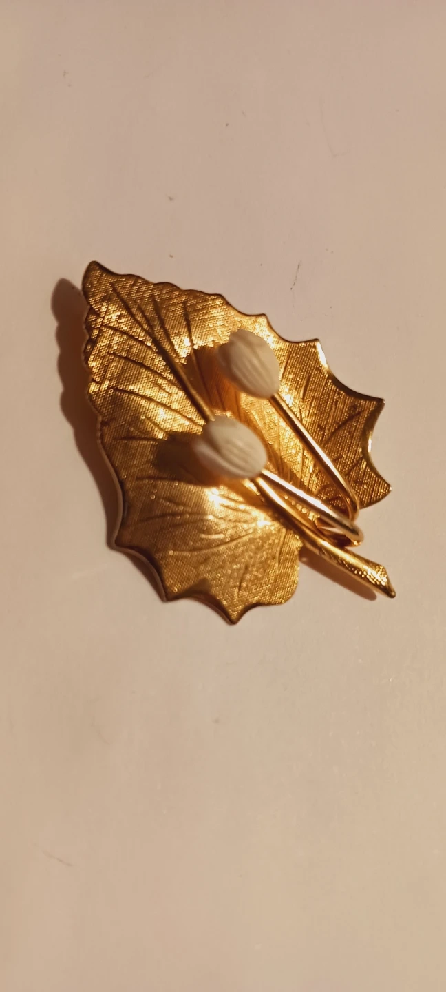 Vintage Gold Tone brooch features a textured gold-tone leaf with two white floral accents. It's a beautiful accessory for any outfit. Pin closure on the back. 2"×1.5". Excellent condition. ALL MY PRICES ARE NEGOTIABLE !+
